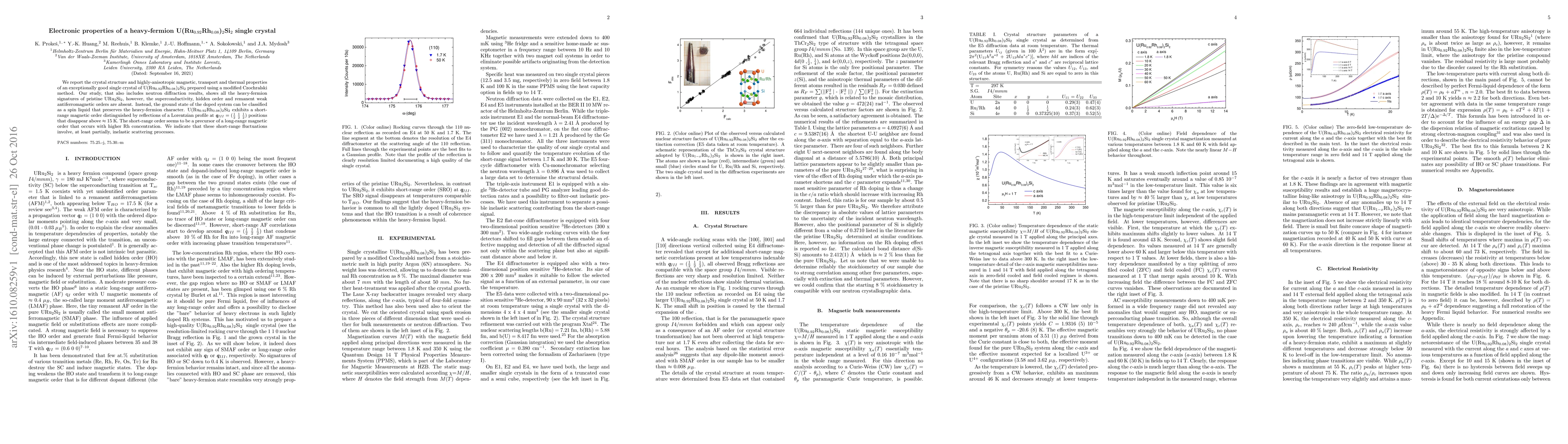 We report the crystal structure and highly-anisotropic magnetic, transport and thermal properties of an exceptionally good single crystal of U(Ru0.92Rh0.08)2Si2 prepared using a modified Czochralski method. Our study, that also includes neutron diffraction results, shows all the heavy-fermion signatures of pristine URu2Si2 , however, the superconductivity, hidden order and remanent weak antiferromagnetic orders are absent. Instead, the ground state of the doped system can be classified as a spin liquid that preserves the heavy-fermion character. U(Ru0.92Rh0.08)2Si2 exhibits a short-range magnetic order distinguished by reflections of a Lorentzian profile at qIII = (1/2 1/2 1/2) positions that disappear above approx. 15 K. The short-range order seems to be a precursor of a long-range magnetic order that occurs with higher Rh concentration. We indicate that these short-range fluctuations involve, at least partially, inelastic scattering processes.