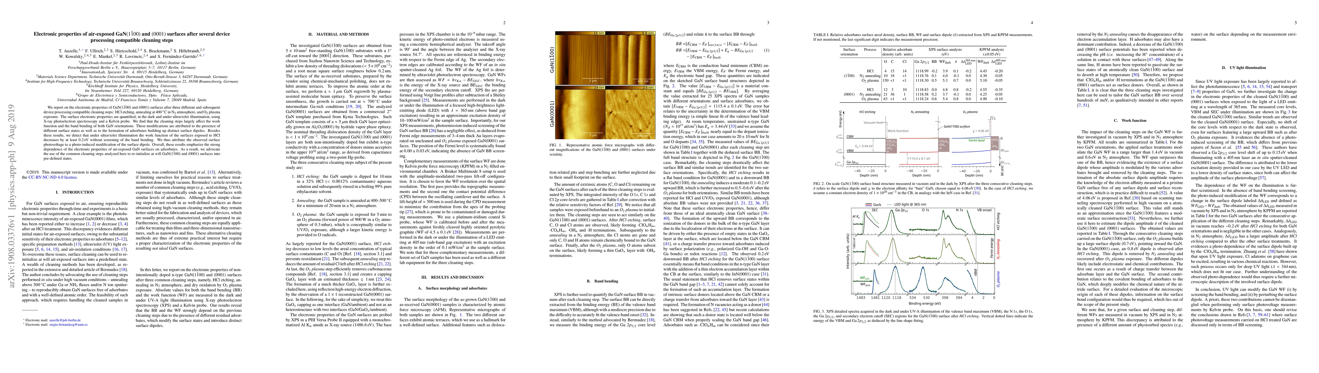 We report on the electronic properties of GaN$(1\bar{1}00)$ and $(0001)$ surfaces after three different and subsequent device processing compatible cleaning steps: HCl etching, annealing at $400$ $^\circ$C in N$_2$ atmosphere, and O$_2$ plasma exposure. The surface electronic properties are quantified, in the dark and under ultraviolet illumination, using X-ray photoelectron spectroscopy and a Kelvin probe. We find that the cleaning steps largely affect the work function and the band bending of both GaN orientations. These modifications are attributed to the presence of different surface states as well as to the formation of adsorbates building up distinct surface dipoles. Besides these results, we detect that under ultraviolet illumination the work function of the surfaces exposed to HCl decreases by at least $0.2$ eV without screening of the band bending. We thus attribute the observed surface photovoltage to a photo-induced modification of the surface dipole. Overall, these results emphasize the strong dependence of the electronic properties of air-exposed GaN surfaces on adsorbates. As a result, we advocate the use of the common cleaning steps analyzed here to re-initialize at will GaN$(1\bar{1}00)$ and $(0001)$ surfaces into pre-defined states.