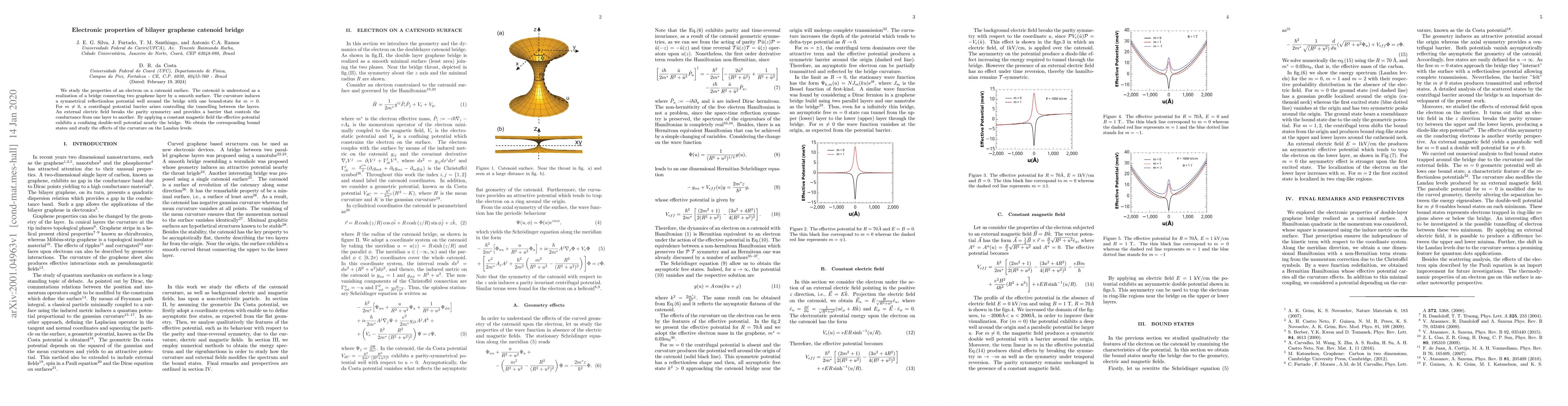 We study the properties of an electron on a catenoid surface. The catenoid is understood as a realization of a bridge connecting two graphene layer by a smooth surface. The curvature induces a symmetrical reflectionless potential well around the bridge with one bound-state for $m=0$. For $m\neq 0$, a centrifugal potential barrier arises controlling the tunnelling between the layers. An external electric field breaks the parity symmetry and provides a barrier that controls the conductance from one layer to another. By applying a constant magnetic field the effective potential exhibits a confining double-well potential nearby the bridge. We obtain the corresponding bound states and study the effects of the curvature on the Landau levels.