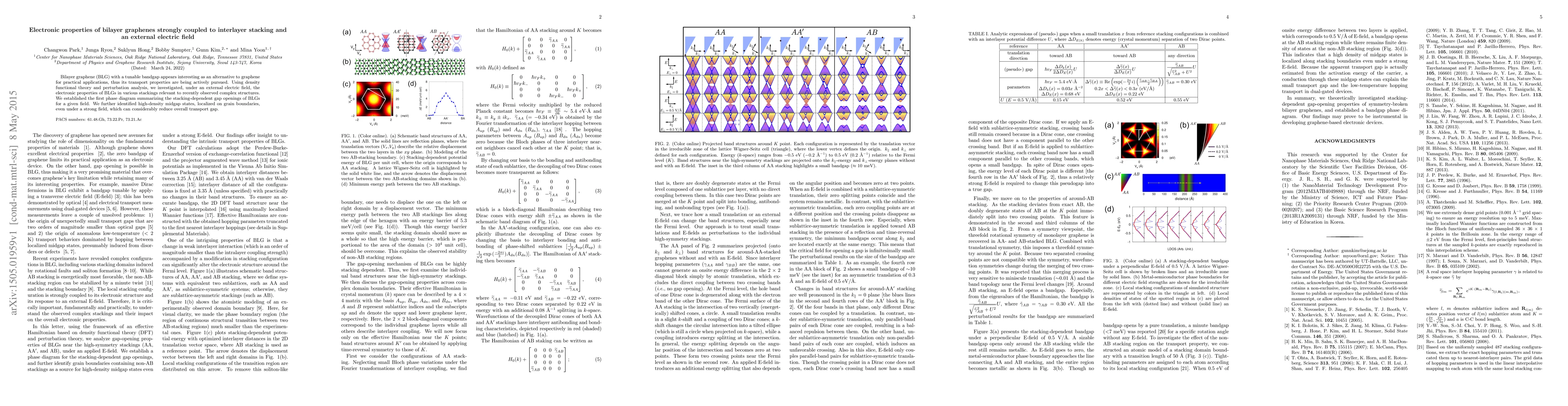 This study uses density functional theory to explore the electronic properties of bilayer graphene under different stackings and external electric fields, revealing a phase diagram that correlates stacking configurations with tunable bandgaps. It also identifies high-density midgap states localized at grain boundaries, which can significantly diminish the transport gap.