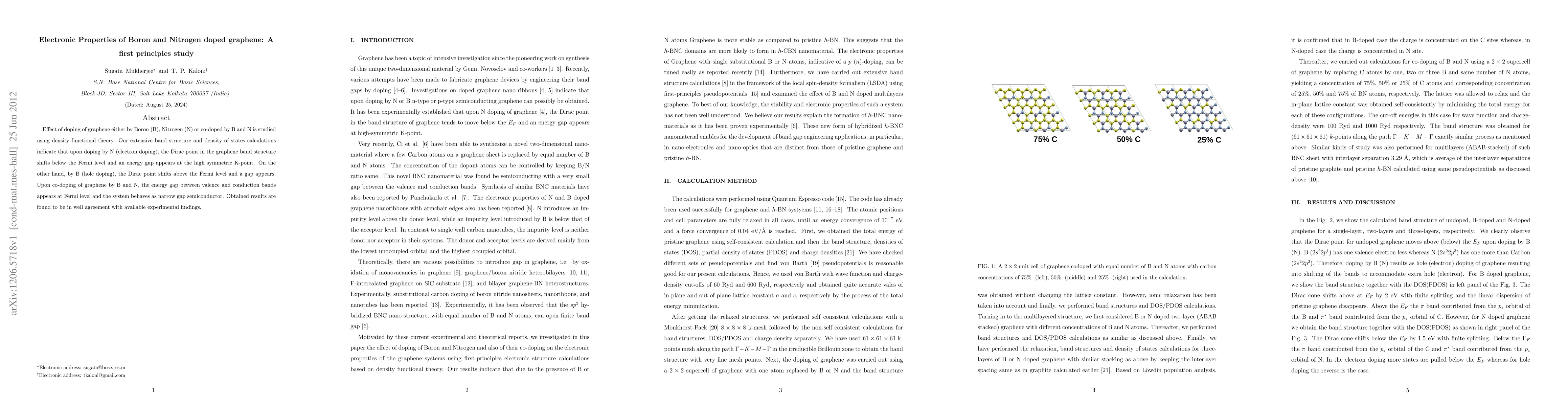 Effect of doping of graphene either by Boron (B), Nitrogen (N) or co-doped by B and N is studied using density functional theory. Our extensive band structure and density of states calculations indicate that upon doping by N (electron doping), the Dirac point in the graphene band structure shifts below the Fermi level and an energy gap appears at the high symmetric K-point. On the other hand, by B (hole doping), the Dirac point shifts above the Fermi level and a gap appears. Upon co-doping of graphene by B and N, the energy gap between valence and conduction bands appears at Fermi level and the system behaves as narrow gap semiconductor. Obtained results are found to be in well agreement with available experimental findings.