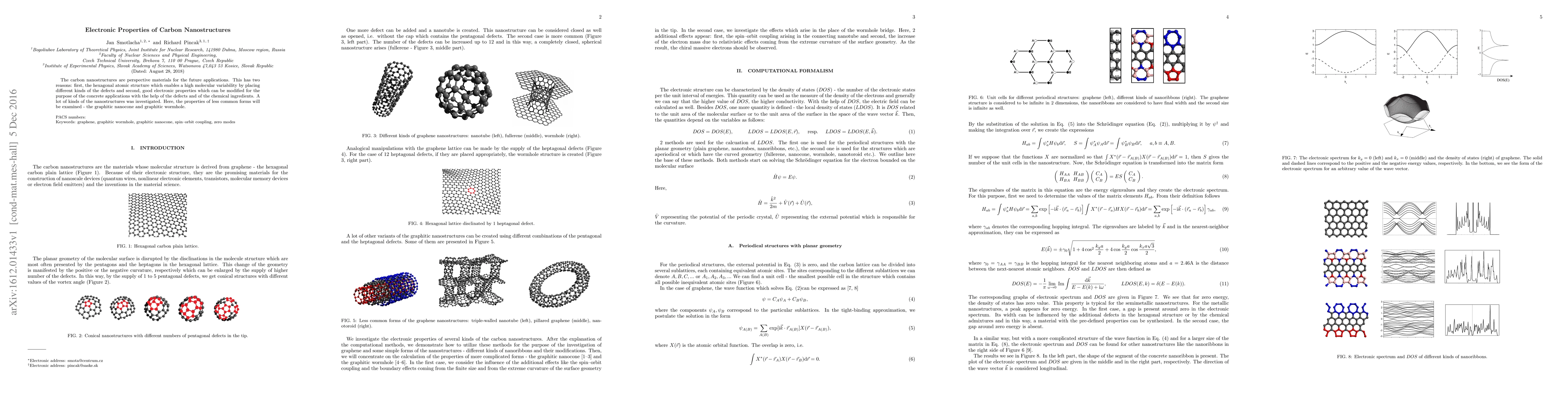 The carbon nanostructures are perspective materials for the future applications. This has two reasons: first, the hexagonal atomic structure which enables a high molecular variability by placing different kinds of the defects and second, good electronic properties which can be modified for the purpose of the concrete applications with the help of the defects and of the chemical ingredients. A lot of kinds of the nanostructures was investigated. Here, the properties of less common forms will be examined - the graphitic nanocone and graphitic wormhole.