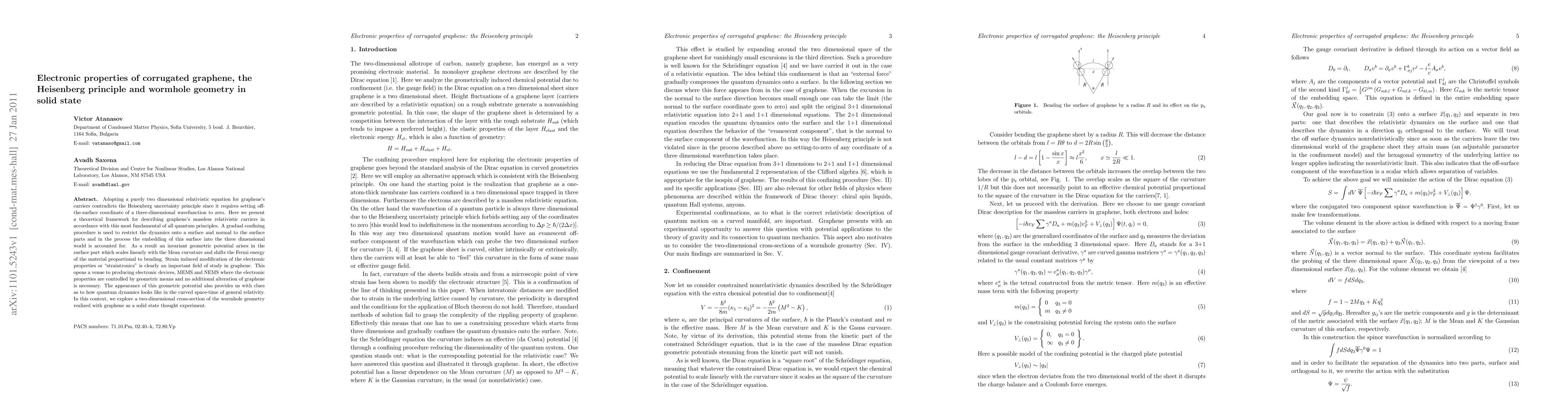 This paper presents a theoretical framework for describing graphene's carriers that aligns with the Heisenberg uncertainty principle, revealing a geometric potential scaling with mean curvature that shifts the Fermi energy with bending. It explores the implications for straintronics and the potential of geometric control in electronic devices, while also considering the quantum dynamics in the context of wormhole geometry.