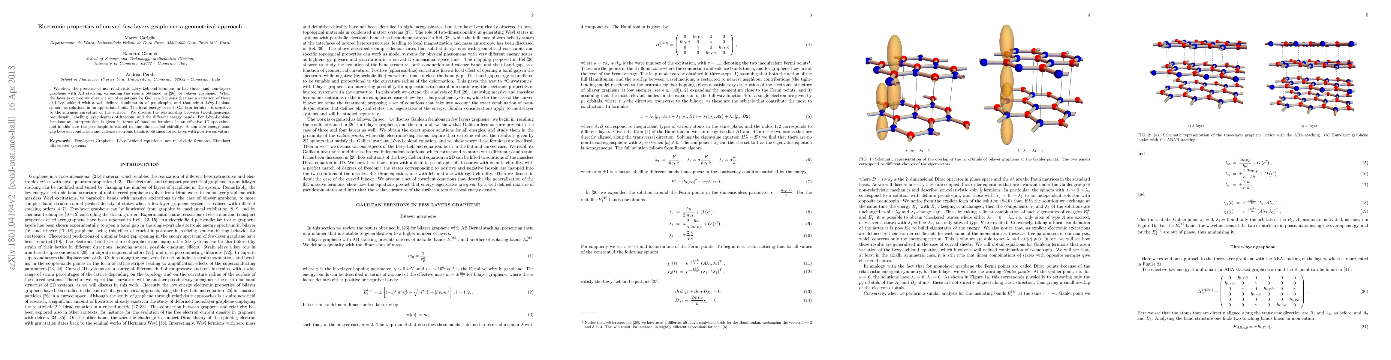 We show the presence of non-relativistic L\'evy-Leblond fermions in flat three- and four-layers graphene with AB stacking, extending the results obtained in [Curvatronics2017] for bilayer graphene. When the layer is curved we obtain a set of equations for Galilean fermions that are a variation of those of L\'evy-Leblond with a well defined combination of pseudospin, and that admit L\'evy-Leblond spinors as solutions in an approriate limit. The local energy of such Galilean fermions is sensitive to the intrinsic curvature of the surface. We discuss the relationship between two-dimensional pseudospin, labelling layer degrees of freedom, and the different energy bands. For L\'evy-Leblond fermions an interpretation is given in terms of massless fermions in an effective 4D spacetime, and in this case the pseudospin is related to four dimensional chirality. A non-zero energy band gap between conduction and valence electronic bands is obtained for surfaces with positive curvature.