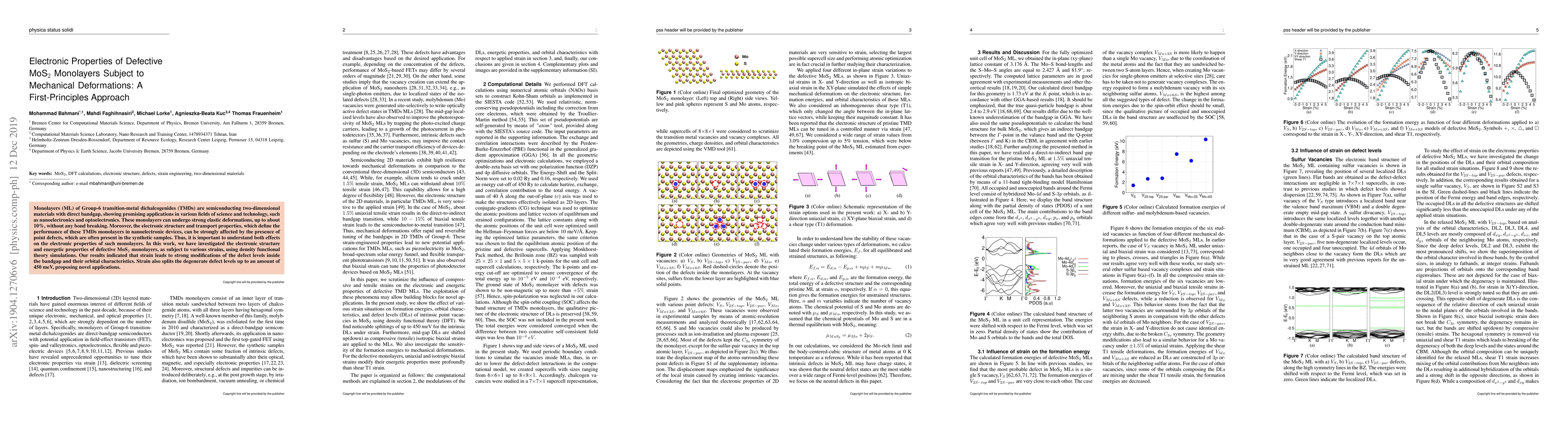 This paper investigates the electronic structure of defective MoS$_{2}$ monolayers under mechanical deformations using first-principles density functional theory. The study finds that strain significantly alters the defect levels within the bandgap and splits degenerate defect levels by up to 450 meV, suggesting potential novel applications.