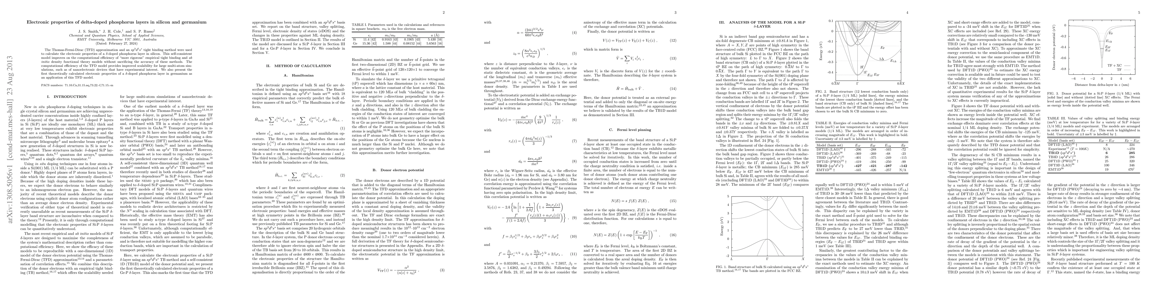 This paper uses the Thomas-Fermi-Dirac (TFD) approximation and an sp3d5s* tight binding method to calculate the electronic properties of delta-doped phosphorus layers in silicon and germanium, demonstrating improved computational efficiency and scalability for large simulations. The TFD model also provides the first theoretical electronic properties for delta-doped phosphorus in germanium.