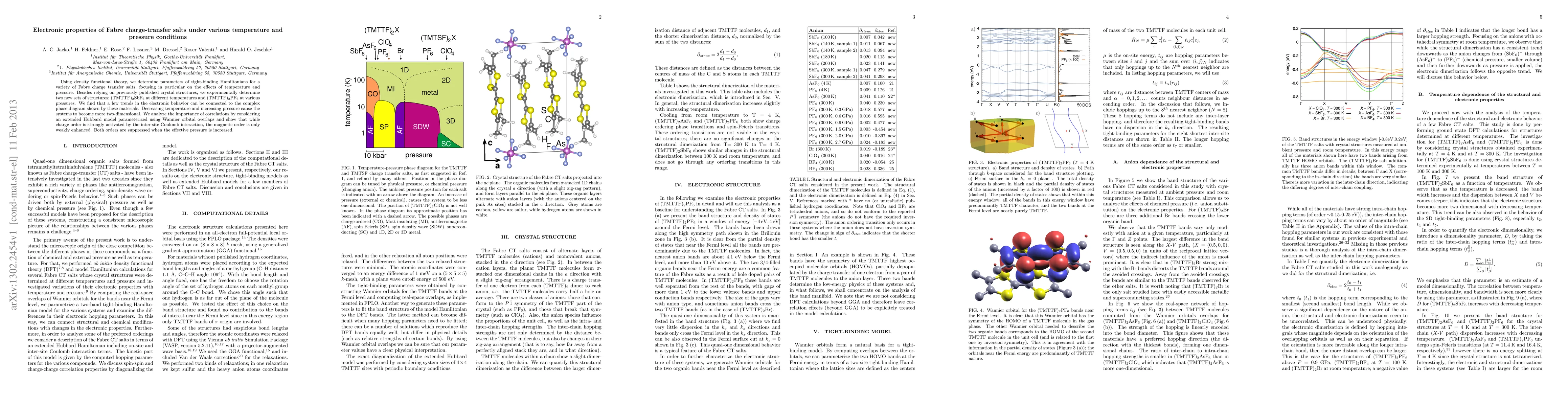 Using density functional theory, we determine parameters of tight-binding Hamiltonians for a variety of Fabre charge transfer salts, focusing in particular on the effects of temperature and pressure. Besides relying on previously published crystal structures, we experimentally determine two new sets of structures; (TMTTF)$_2$SbF$_6$ at different temperatures and (TMTTF)$_2$PF$_6$ at various pressures. We find that a few trends in the electronic behavior can be connected to the complex phase diagram shown by these materials. Decreasing temperature and increasing pressure cause the systems to become more two-dimensional. We analyze the importance of correlations by considering an extended Hubbard model parameterized using Wannier orbital overlaps and show that while charge order is strongly activated by the inter-site Coulomb interaction, the magnetic order is only weakly enhanced. Both orders are suppressed when the effective pressure is increased.