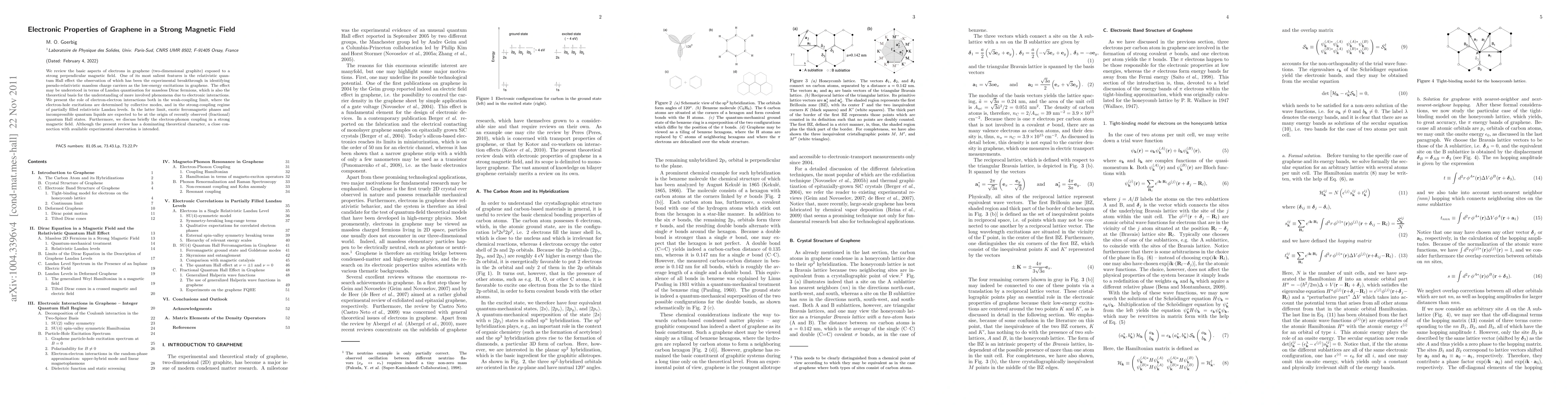 This paper reviews the electronic properties of graphene under strong magnetic fields, highlighting the relativistic quantum Hall effect and Landau quantization of massless Dirac fermions. It discusses electron-electron interactions and their role in generating exotic phases and fractional quantum Hall states, alongside a brief mention of electron-phonon coupling.