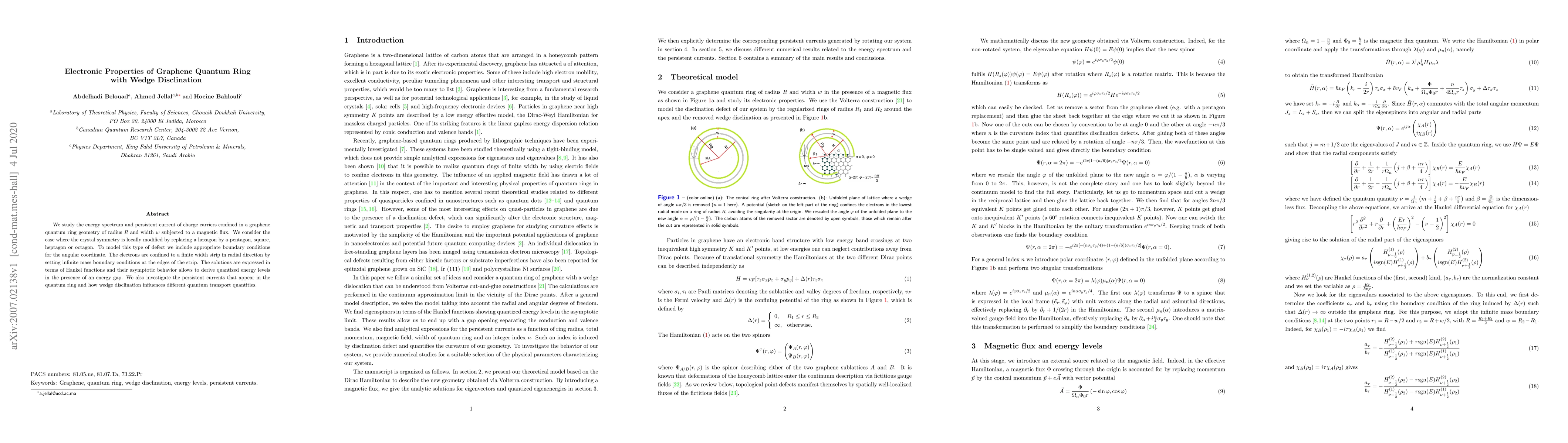 This paper investigates the electronic properties of a graphene quantum ring with a wedge disclination, focusing on quantized energy levels and persistent currents. The study employs boundary conditions to model the defect, revealing an energy gap and analyzing how the wedge disclination affects quantum transport properties.