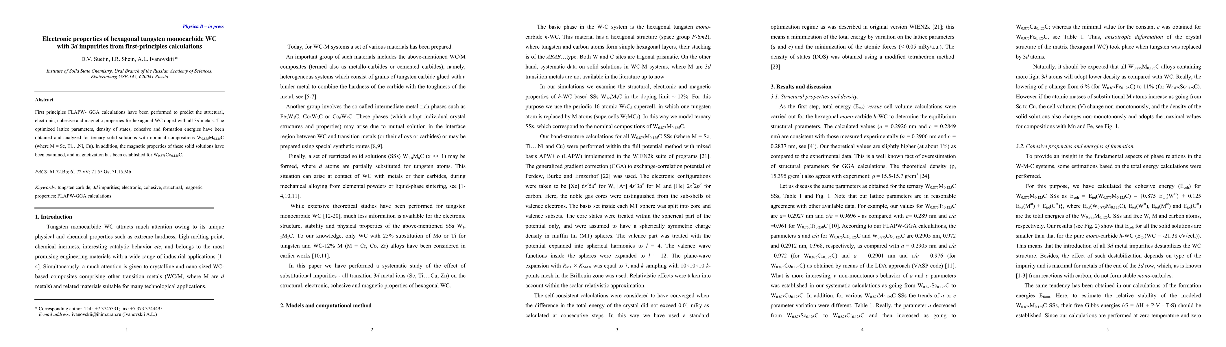 Researchers used first-principles calculations to study the electronic properties of hexagonal tungsten monocarbide (WC) doped with 3d metals like Scandium to Cobalt. The study predicts changes in magnetic properties and provides insights into potential applications.