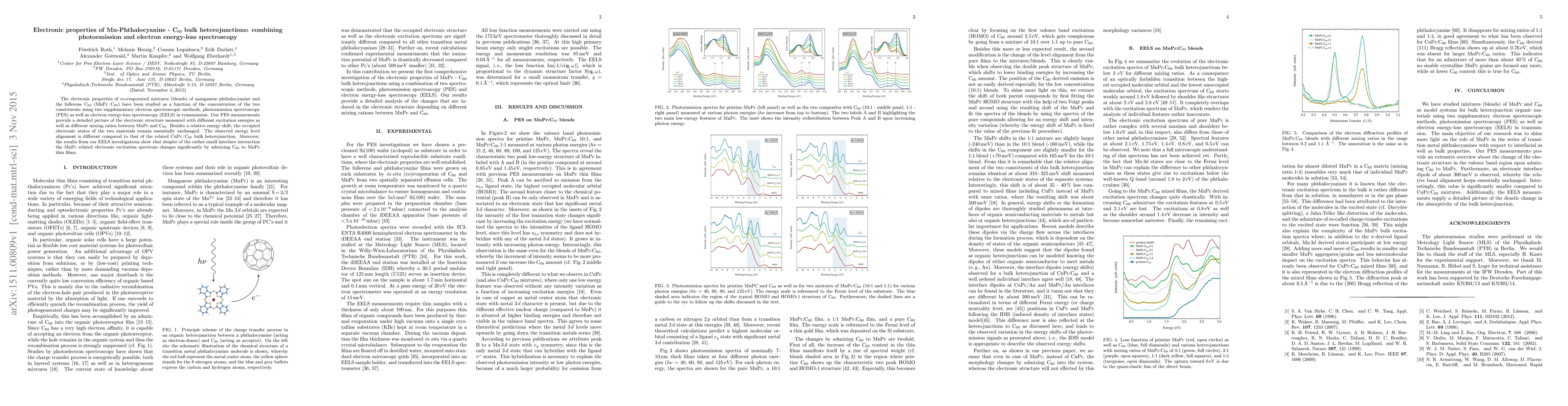 The electronic properties of co-evaporated mixtures (blends) of manganese phthalocyanine and the fullerene C$_{60}$ (MnPc:C$_{60}$) have been studied as a function of the concentration of the two constituents using two supplementary electron spectroscopic methods, photoemission spectroscopy (PES) as well as electron energy-loss spectroscopy (EELS) in transmission. Our PES measurements provide a detailed picture of the electronic structure measured with different excitation energies as well as different mixing ratios between MnPc and C$_{60}$. Besides a relative energy shift, the occupied electronic states of the two materials remain essentially unchanged. The observed energy level alignment is different compared to that of the related CuPc:C$_{60}$ bulk heterojunction. Moreover, the results from our EELS investigations show that despite of the rather small interface interaction the MnPc related electronic excitation spectrum changes significantly by admixing C$_{60}$ to MnPc thin films.