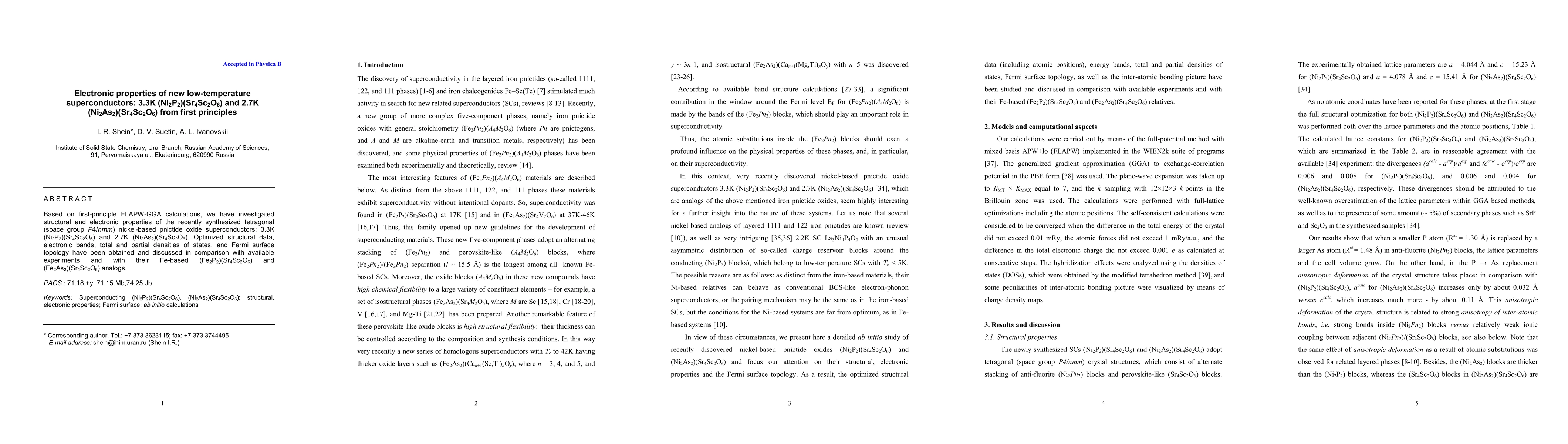 This study uses first-principle FLAPW-GGA calculations to investigate the structural and electronic properties of newly synthesized nickel-based pnictide oxide superconductors, (Ni2P2)(Sr4Sc2O6) and (Ni2As2)(Sr4Sc2O6), finding superconducting transitions at 3.3K and 2.7K respectively, and compares these findings with experimental data and Fe-based analogs.