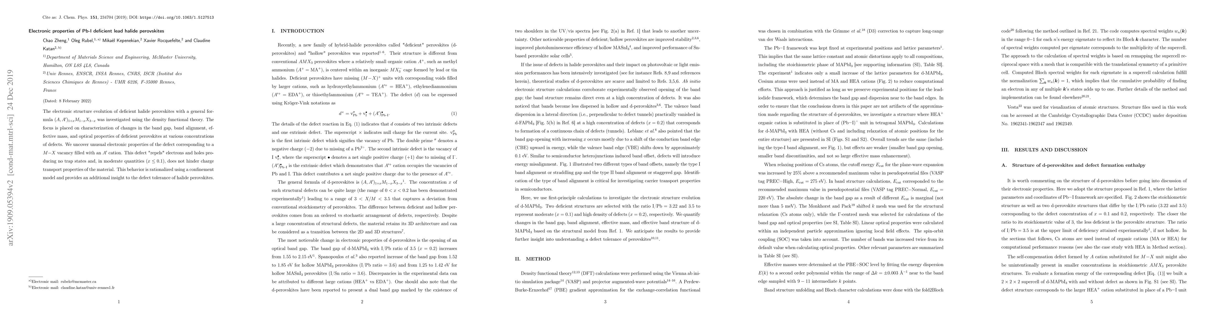 This paper investigates the electronic properties of lead halide perovskites with Pb-I deficiencies using density functional theory, revealing that specific defects do not hinder charge transport and can even enhance material properties, providing new insights into defect tolerance.