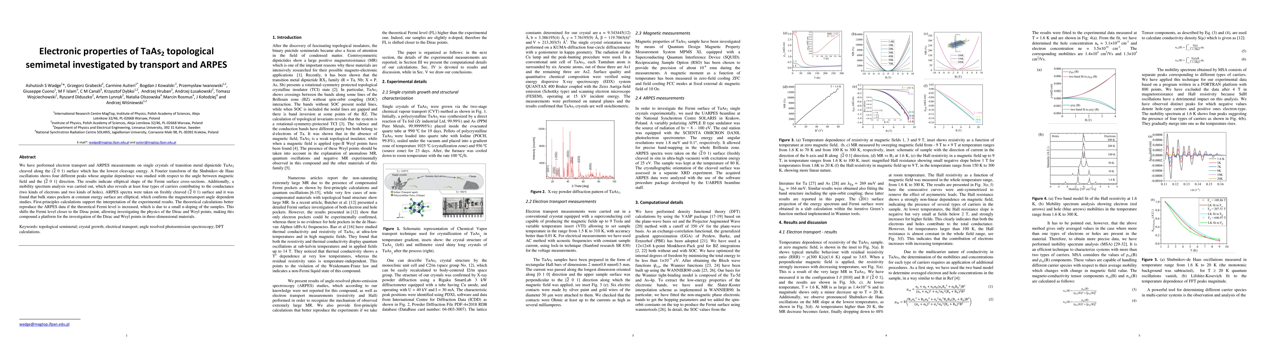 Researchers investigated TaAs2, a topological semimetal, using transport and ARPES measurements to find an elliptical Fermi surface and multiple types of carriers contributing to its conductance.