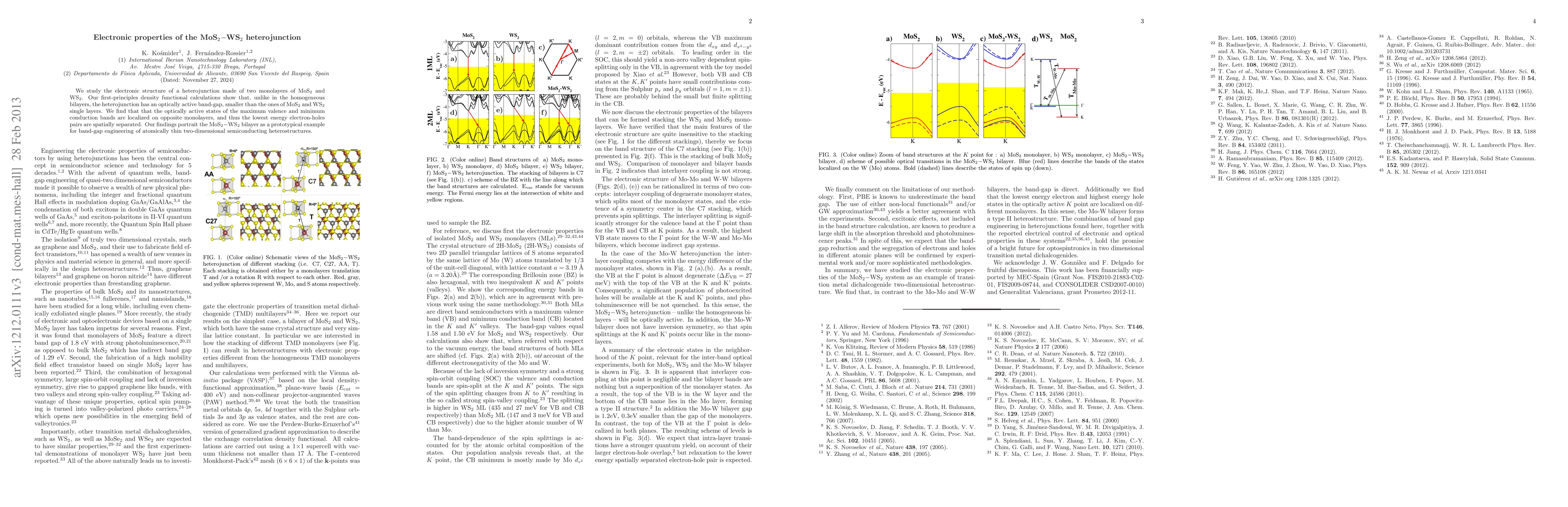 This study presents a detailed first-principles analysis of the electronic properties of a MoS2-WS2 heterojunction, highlighting its direct band-gap and type II heterostructure characteristics.