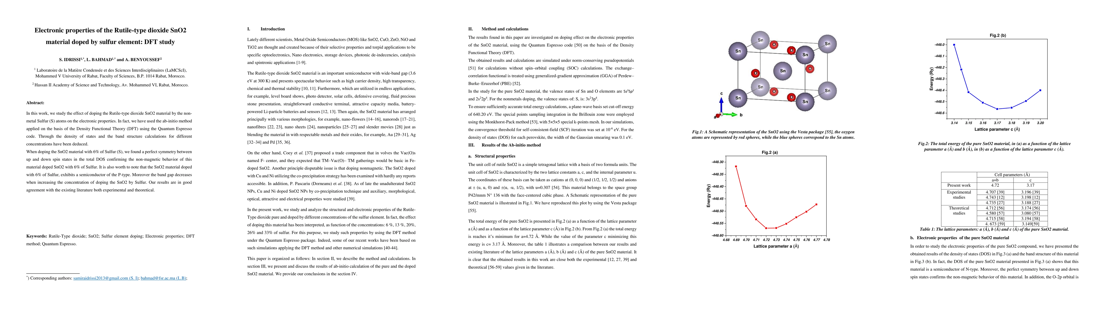 This study employs Density Functional Theory (DFT) to investigate how doping SnO2 with sulfur affects its electronic properties, finding that 6% sulfur doping leads to a non-magnetic, P-type semiconductor with a reduced band gap. The results align well with both theoretical and experimental literature.