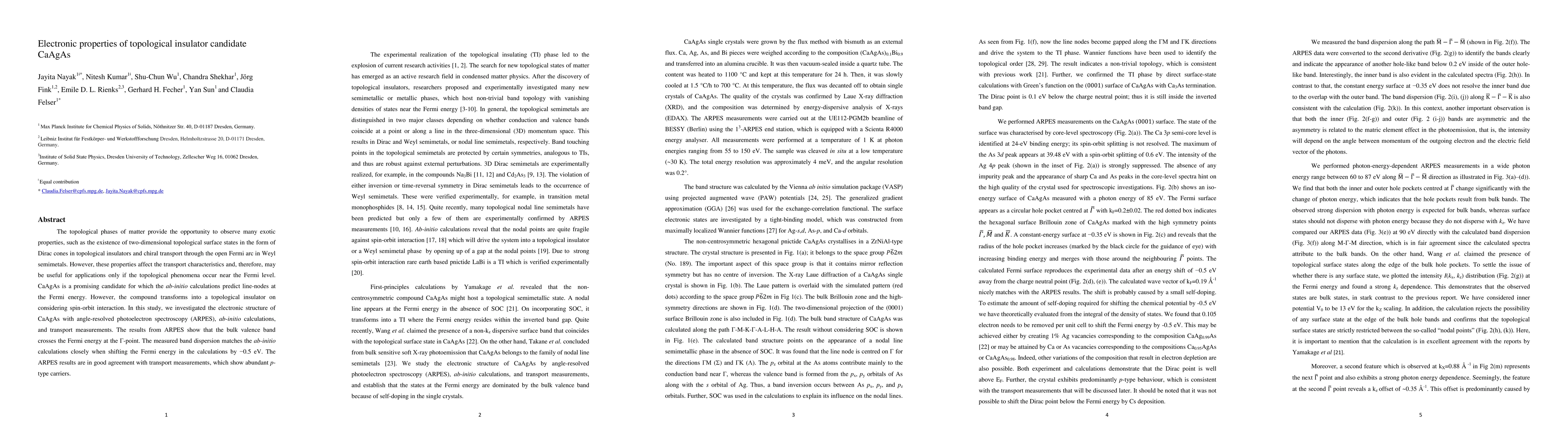 The study investigates the electronic properties of CaAgAs, a topological insulator candidate, using ARPES, ab-initio calculations, and transport measurements. Results indicate a bulk valence band crossing the Fermi level, supporting the material's potential as a topological insulator.