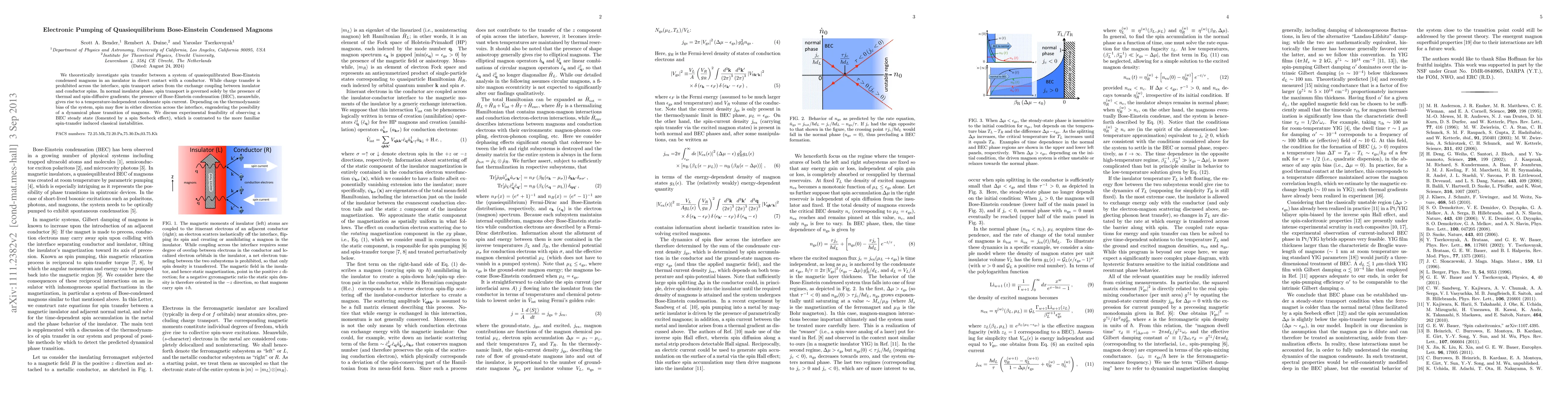 This paper explores the theoretical mechanism of spin transfer between a Bose-Einstein condensed magnon system in an insulator and a conductor, revealing a temperature-independent condensate spin current. The study highlights the potential for dynamical phase transitions in magnons and discusses the feasibility of observing these effects experimentally.
