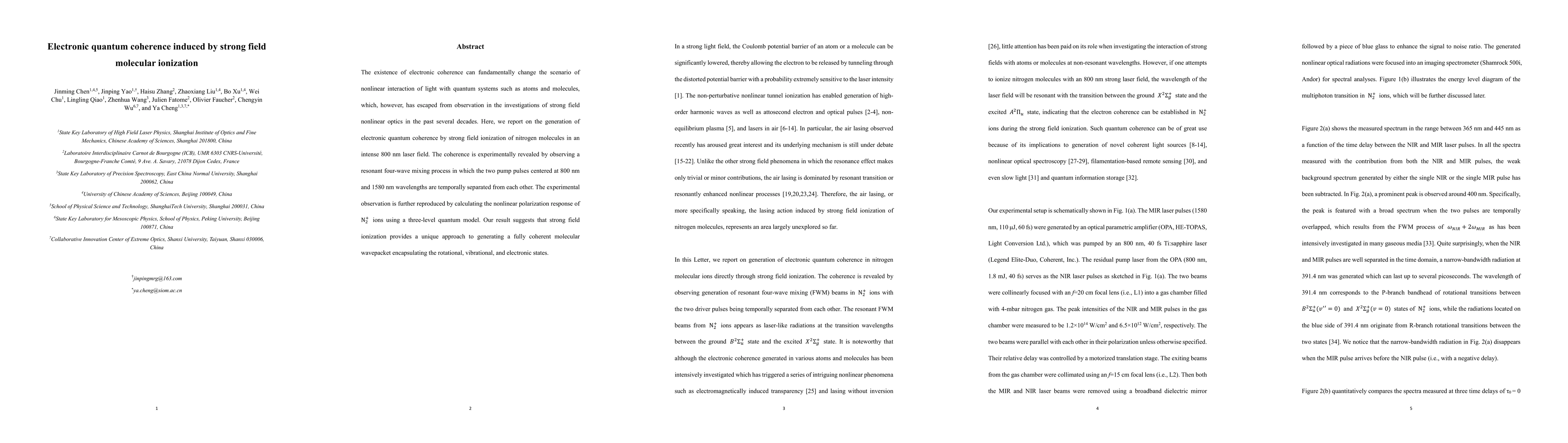 This paper reports the generation of electronic quantum coherence in nitrogen molecules via strong field ionization using an intense 800 nm laser, observed through a resonant four-wave mixing process. The findings suggest strong field ionization as a method to create a fully coherent molecular wavepacket.