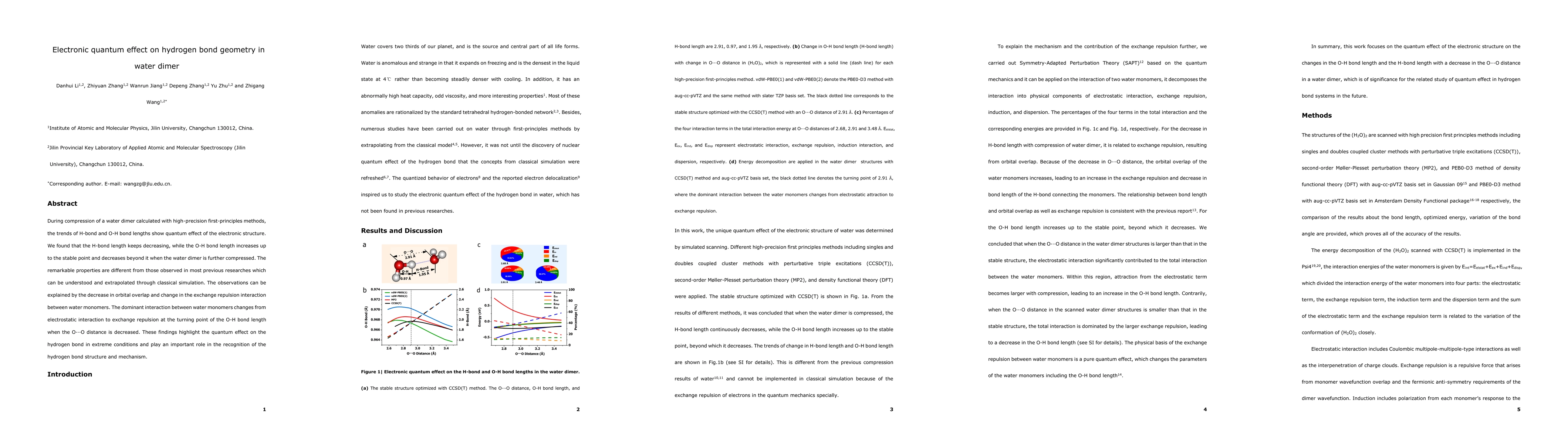 This study reveals quantum effects on hydrogen bond geometry in a water dimer under compression, showing that H-bond length decreases while O-H bond length initially increases and then decreases beyond a stable point. These findings highlight the shift from electrostatic to exchange repulsion interactions, emphasizing the quantum influence on hydrogen bonds in extreme conditions.