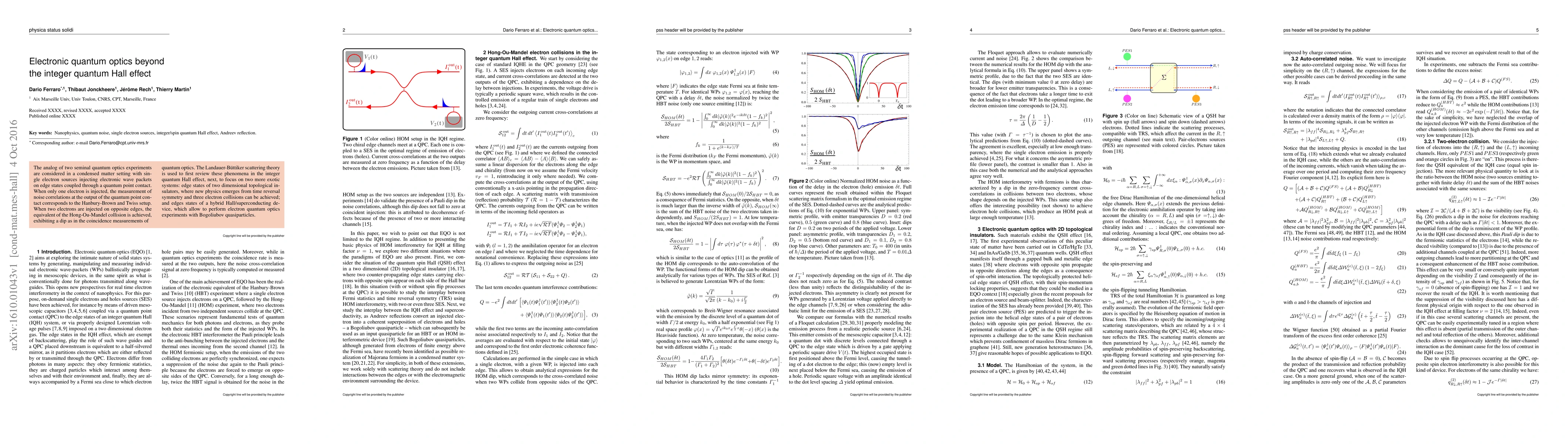 This paper explores electronic quantum optics phenomena analogous to quantum optics experiments in condensed matter systems, specifically using quantum point contacts. It demonstrates the Hanbury-Brown and Twiss effect and the Hong-Ou-Mandel collision using single and dual electron sources, respectively, and extends these findings to topological insulators and hybrid Hall/superconducting devices.