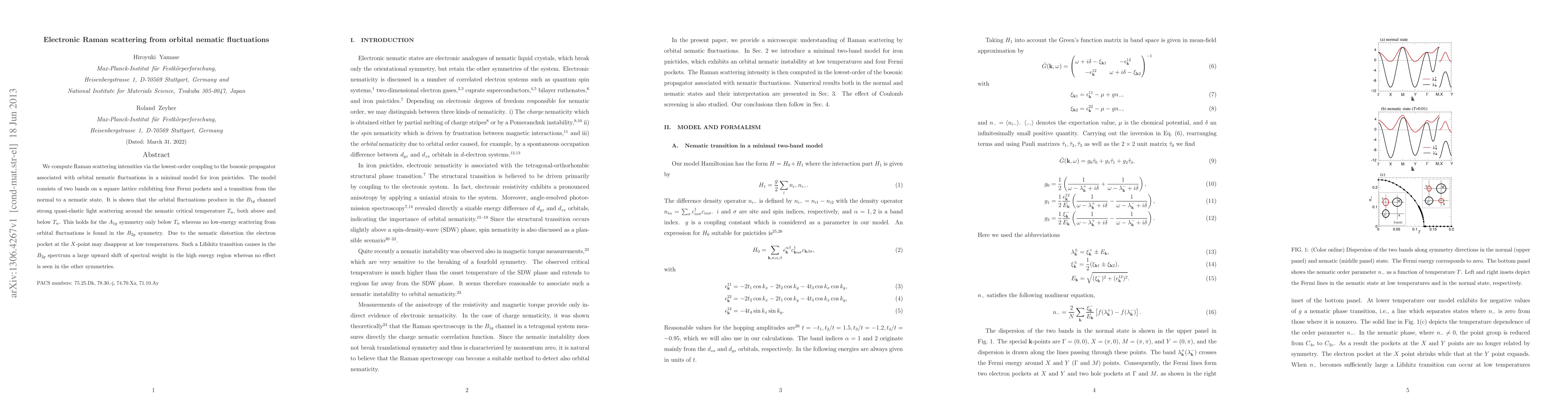 This paper investigates Raman scattering intensities in iron pnictides, revealing strong quasi-elastic light scattering from orbital nematic fluctuations in the B1g channel near the nematic critical temperature Tn. The study finds no low-energy scattering in the B2g symmetry, and a Lifshitz transition causes a significant spectral weight shift in the high-energy region due to the nematic distortion.