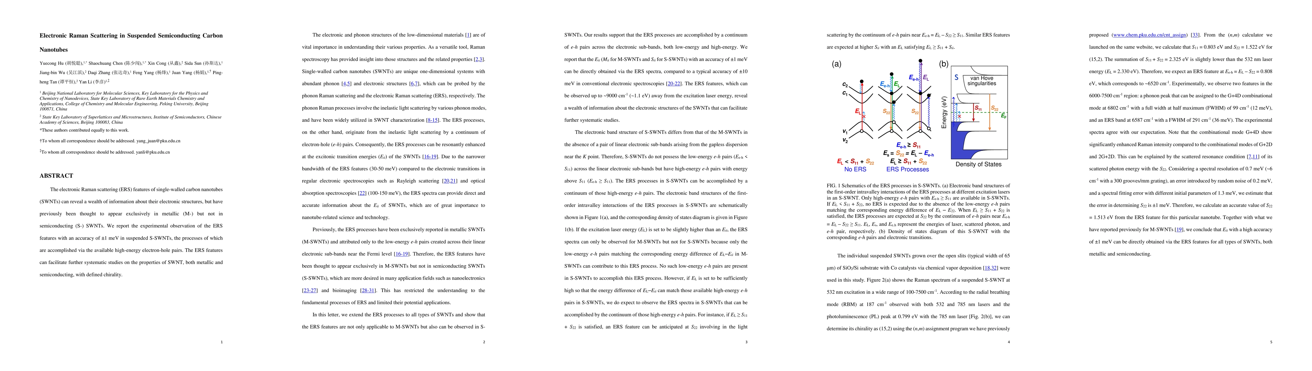 The study reports the first observation of electronic Raman scattering in suspended semiconducting single-walled carbon nanotubes, revealing their electronic structures and facilitated by high-energy electron-hole pairs. This discovery opens new avenues for systematic studies on the properties of semiconducting carbon nanotubes with defined chirality.