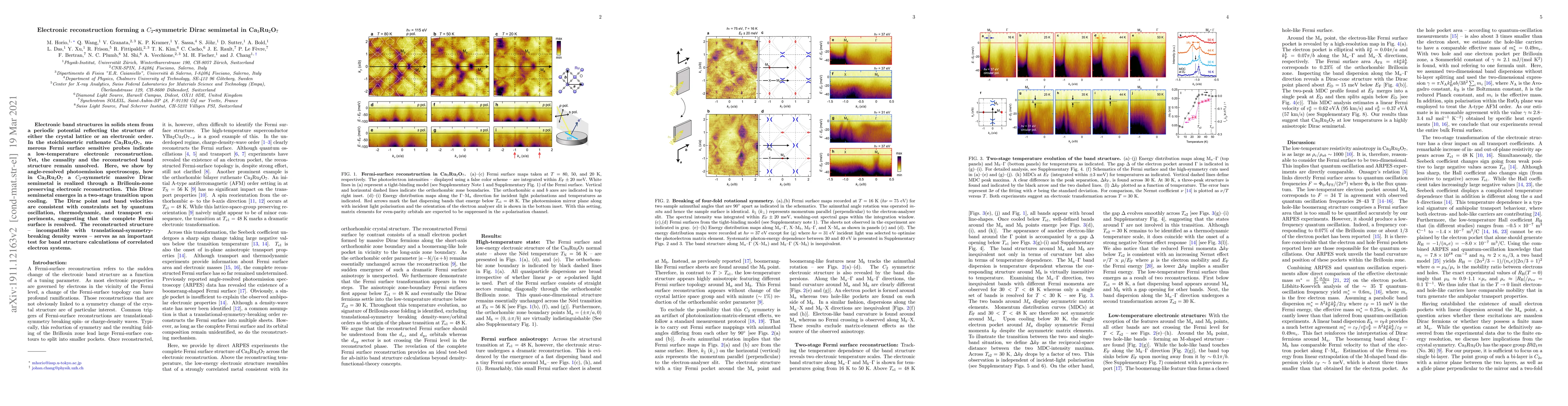 This research reveals that Ca$_3$Ru$_2$O$_7$ undergoes a low-temperature electronic reconstruction resulting in a $C_2$-symmetric Dirac semimetal, identified via angle-resolved photoemission spectroscopy, marking a two-stage transition. The reconstructed band structure, without breaking translational symmetry, challenges traditional band calculations for correlated electron systems.