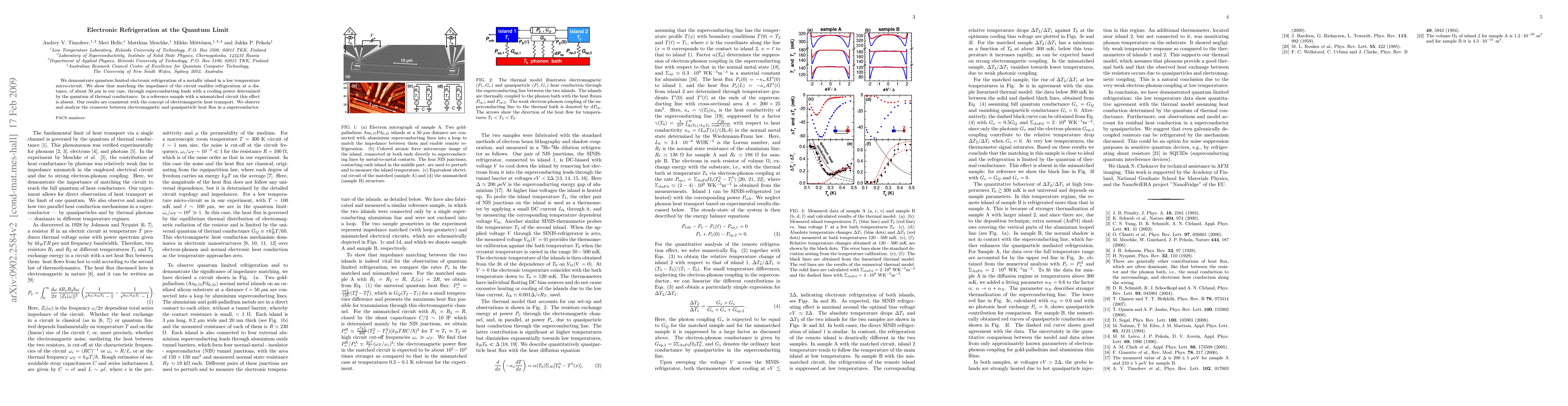 We demonstrate quantum limited electronic refrigeration of a metallic island in a low temperature micro-circuit. We show that matching the impedance of the circuit enables refrigeration at a distance, of about 50 um in our case, through superconducting leads with a cooling power determined by the quantum of thermal conductance. In a reference sample with a mismatched circuit this effect is absent. Our results are consistent with the concept of electromagnetic heat transport. We observe and analyze the crossover between electromagnetic and quasiparticle heat flux in a superconductor.