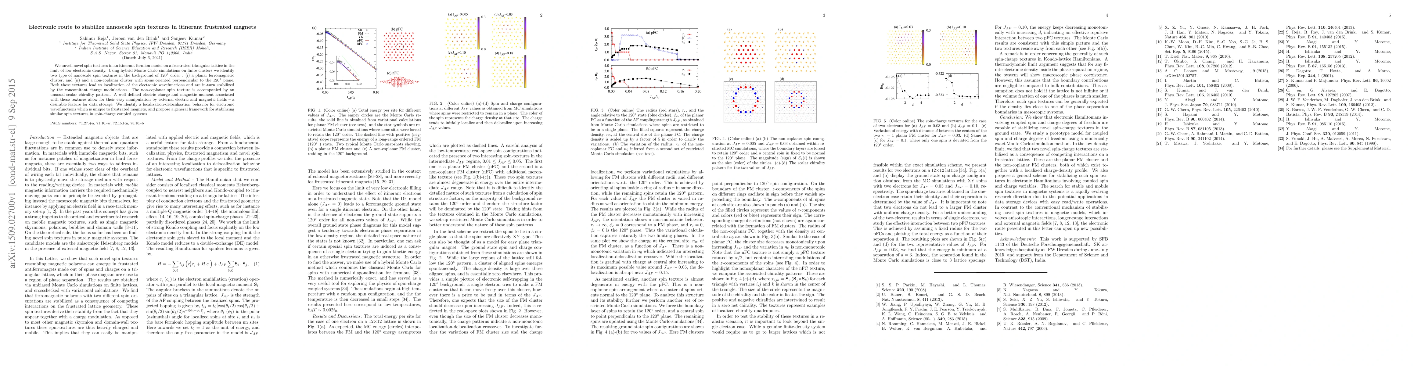 This paper explores novel nanoscale spin textures in itinerant frustrated magnets on a triangular lattice, identifying two types: planar ferromagnetic and non-coplanar clusters. These textures stabilize electronic wavefunctions via charge modulations and can be manipulated by electric and magnetic fields, offering potential for data storage.