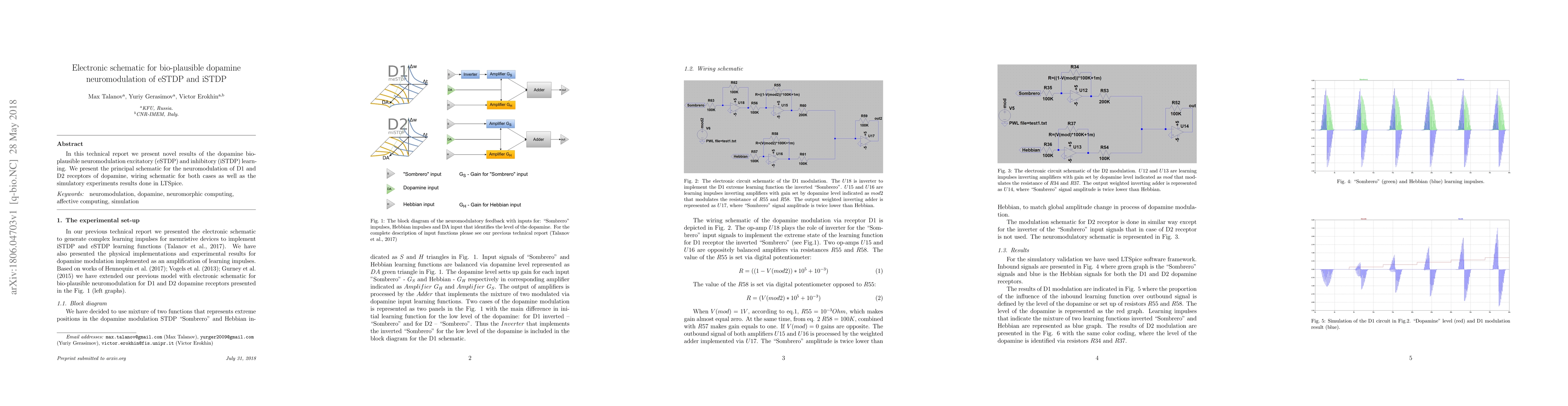 In this technical report we present novel results of the dopamine bio-plausible neuromodulation excitatory (eSTDP) and inhibitory (iSTDP) learning. We present the principal schematic for the neuromodulation of D1 and D2 receptors of dopamine, wiring schematic for both cases as well as the simulatory experiments results done in LTSpice.