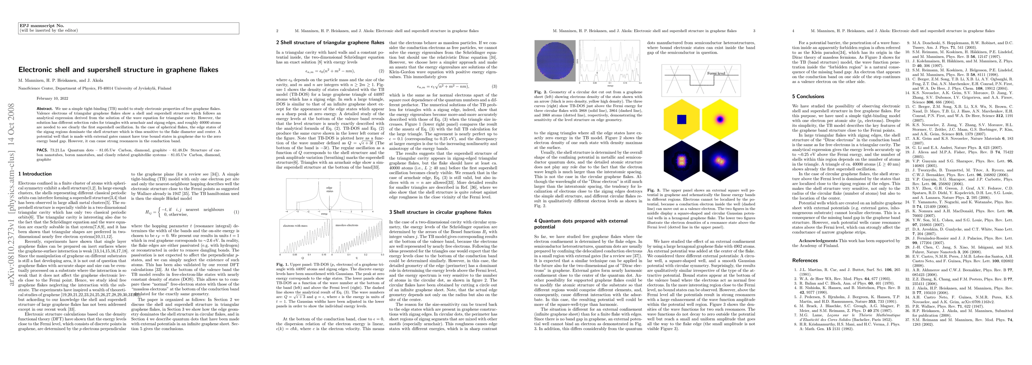 This paper investigates the electronic shell and supershell structure in triangular and spherical graphene flakes using a tight-binding model. It finds distinct shell behaviors for armchair and zigzag edges, with supershell oscillations visible only in large flakes, and notes that external gates can induce strong resonances despite graphene's zero band gap.