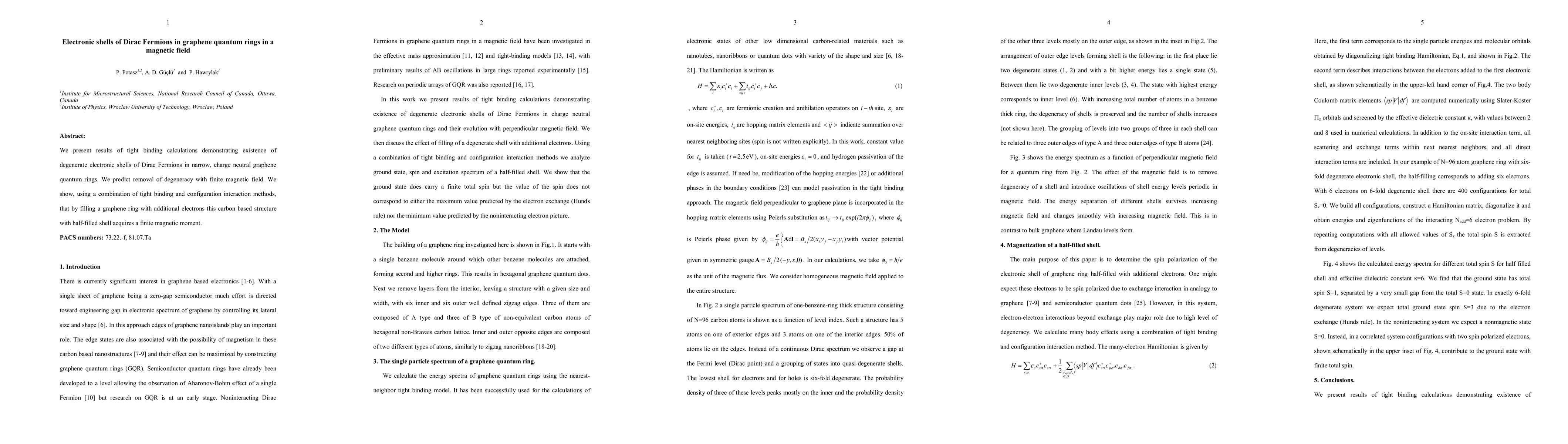 Summary: Tight binding calculations reveal the existence of degenerate electronic shells in graphene quantum rings, which lose their degeneracy under a magnetic field. Additionally, filling the ring with more electrons endows it with a finite magnetic moment.