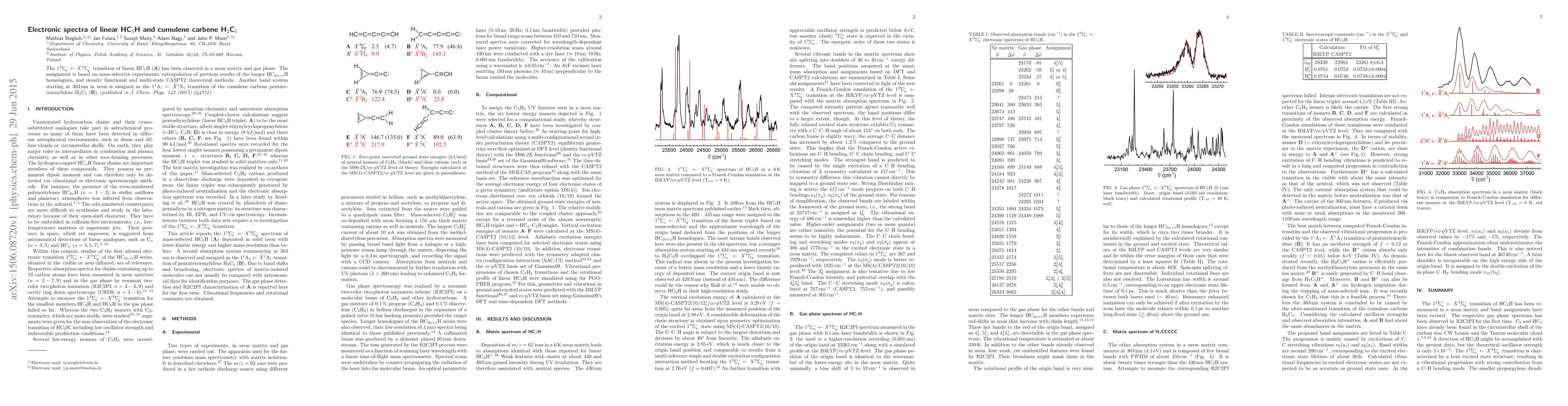 The $1 ^3\Sigma_u^- \leftarrow X^3\Sigma_g^-$ transition of linear HC$_5$H (A) has been observed in a neon matrix and gas phase. The assignment is based on mass-selective experiments, extrapolation of previous results of the longer HC$_{2n+1}$H homologues, and density functional and multi-state CASPT2 theoretical methods. Another band system starting at 303 nm in neon is assigned as the $1 ^1 A_1 \leftarrow X ^1 A_1$ transition of the cumulene carbene pentatetraenylidene H$_2$C$_5$ (B).