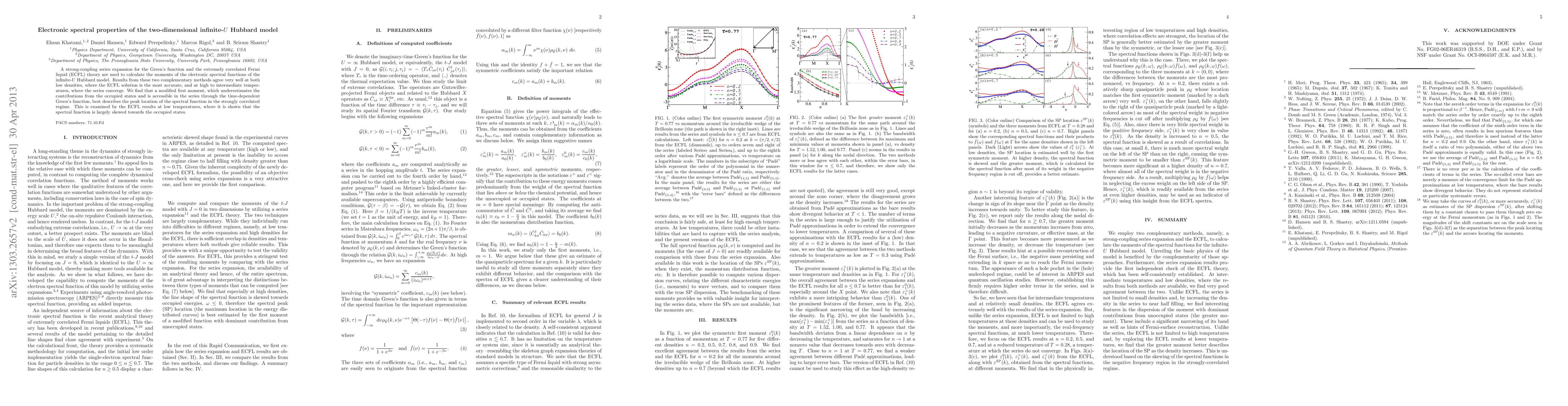 The study uses two methods to calculate electronic spectral properties in the infinite-U Hubbard model, finding agreement between them at low densities and high temperatures, and highlighting a modified first moment as a useful descriptor of quasiparticle peak location.