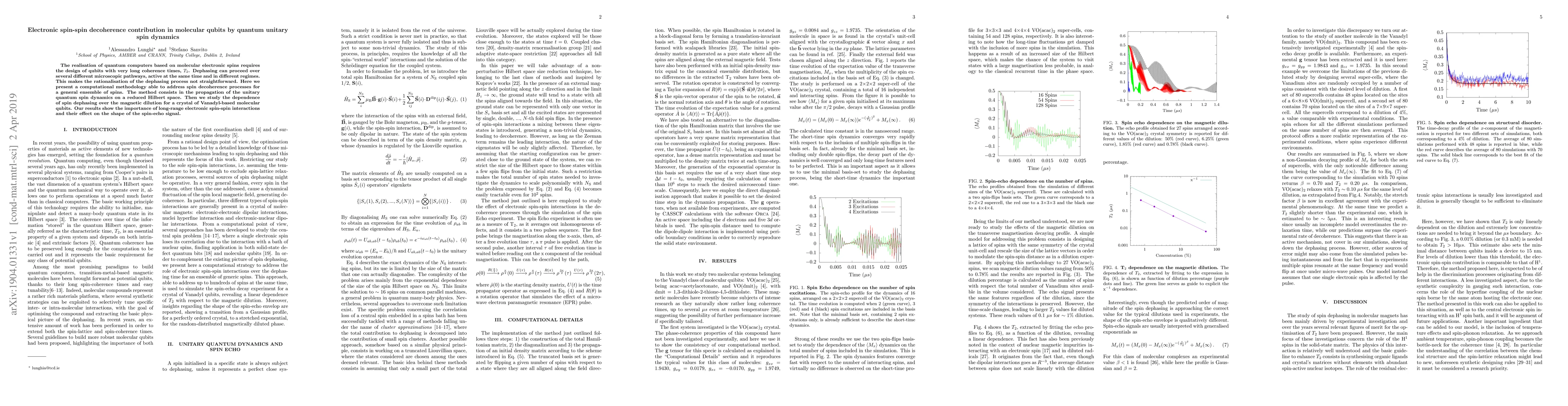 This paper introduces a computational method to analyze electronic spin-spin decoherence in molecular qubits, focusing on the unitary quantum spin dynamics. The study reveals the significance of long-range interactions in shaping the spin-echo signal and decoherence in Vanadyl-based qubit crystals.