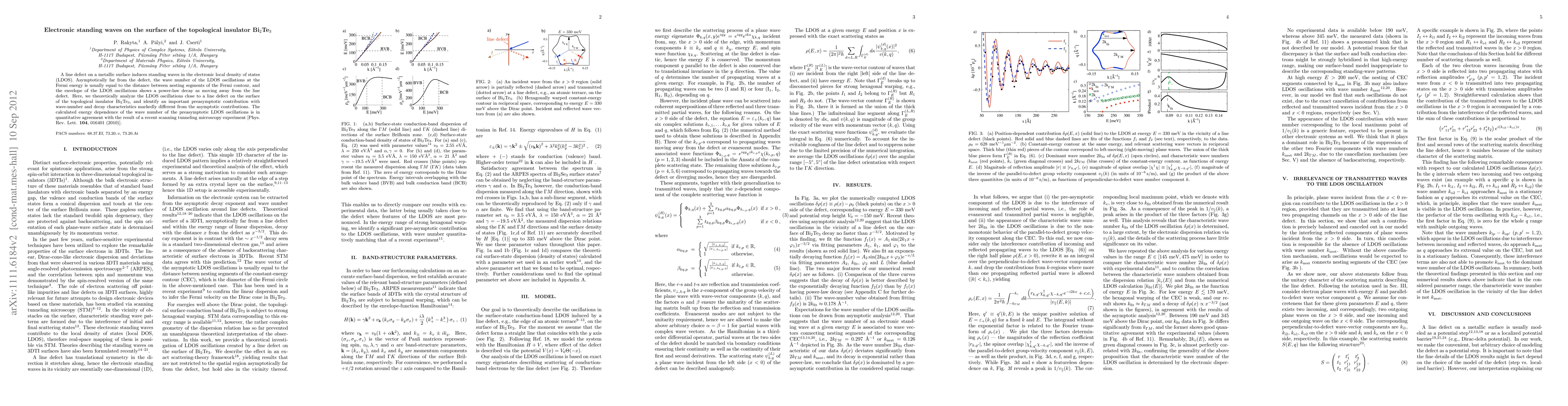 This research theoretically analyzes electronic standing waves near a line defect on the surface of the topological insulator Bi2Te3. It identifies a pre-asymptotic contribution with unique wave number and decay characteristics, aligning with experimental data from scanning tunneling microscopy.