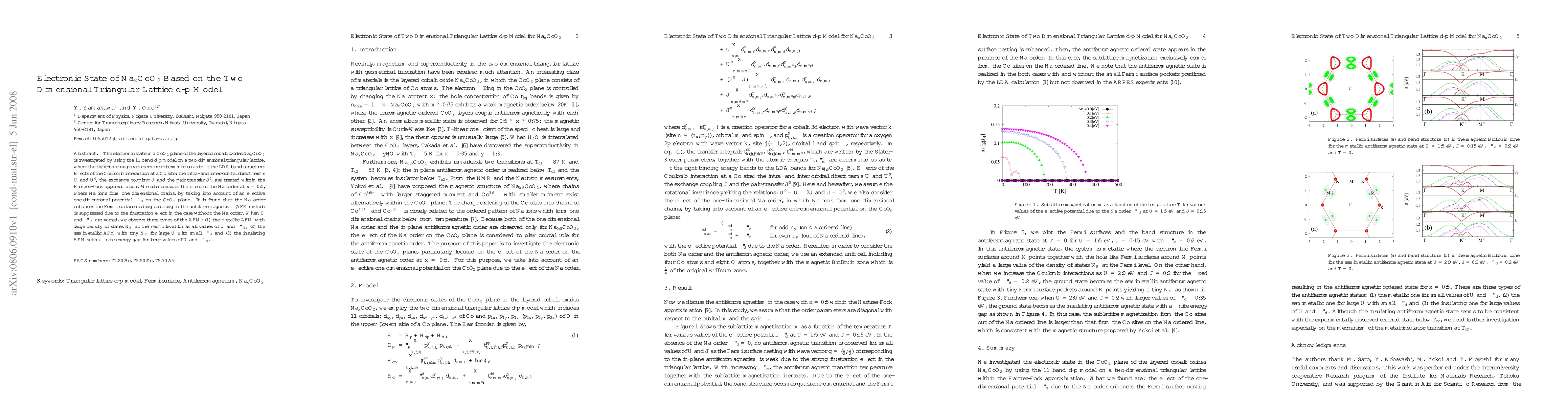 This paper investigates the electronic state of Na_xCoO_2 using a 11-band d-p model on a two-dimensional triangular lattice, focusing on the effects of Coulomb interactions and Na order. It reveals three types of antiferromagnetic states based on variations in U and an effective one-dimensional potential.