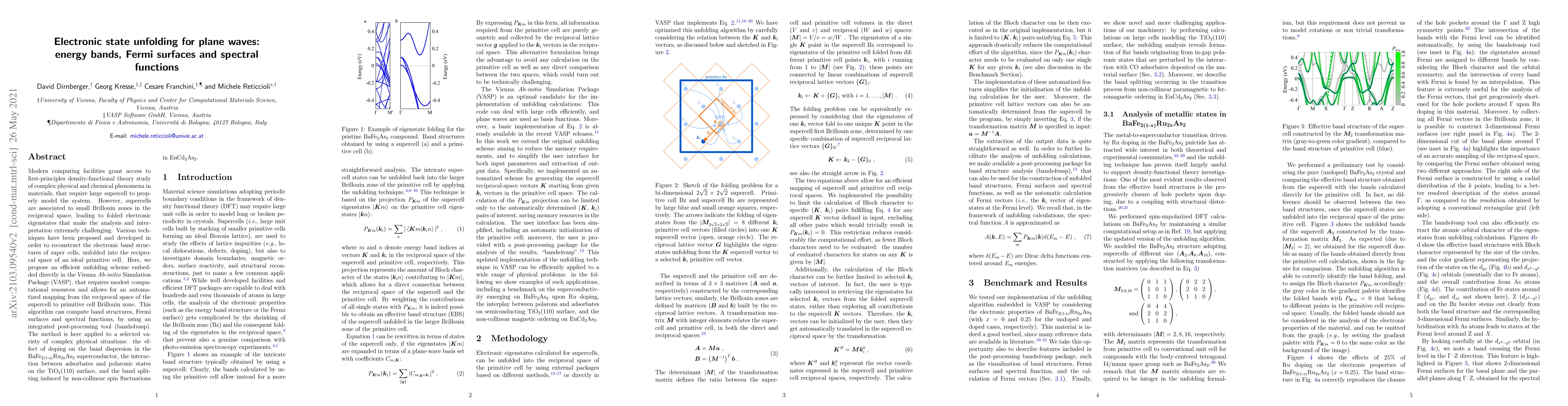 This paper presents an efficient unfolding scheme within VASP to reconstruct electronic band structures from supercells into the primitive cell Brillouin zone, facilitating analysis of complex materials phenomena. The method computes band structures, Fermi surfaces, and spectral functions, demonstrated through applications in superconductors, surface interactions, and spin fluctuations.