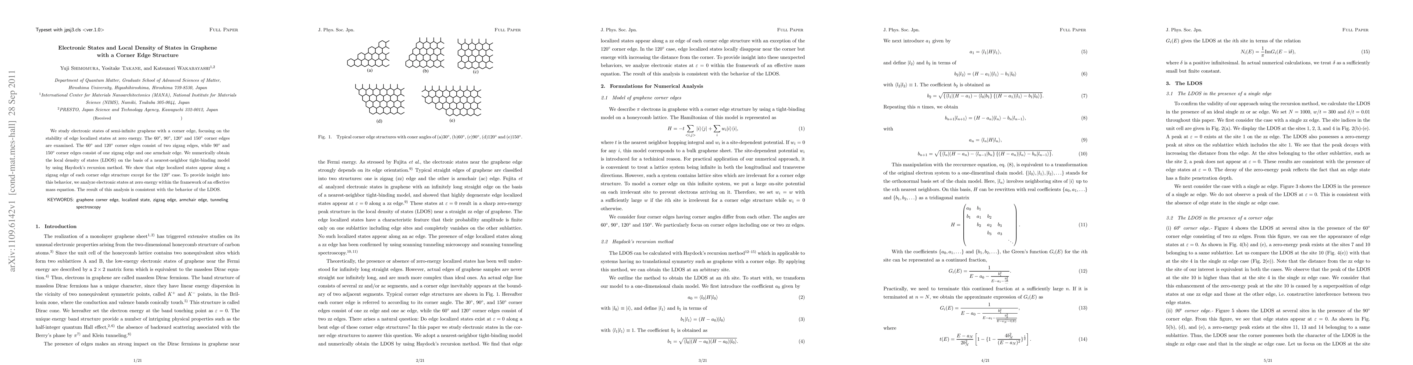 We study electronic states of semi-infinite graphene with a corner edge, focusing on the stability of edge localized states at zero energy. The 60{\deg}, 90{\deg}, 120{\deg} and 150{\deg} corner edges are examined. The 60{\deg} and 120{\deg} corner edges consist of two zigzag edges, while 90{\deg} and 150{\deg} corner edges consist of one zigzag edge and one armchair edge. We numerically obtain the local density of states (LDOS) on the basis of a nearest-neighbor tight-binding model by using Haydock's recursion method. We show that edge localized states appear along a zigzag edge of each corner edge structure except for the 120{\deg} case. To provide insight into this behavior, we analyze electronic states at zero energy within the framework of an effective mass equation. The result of this analysis is consistent with the behavior of the LDOS.