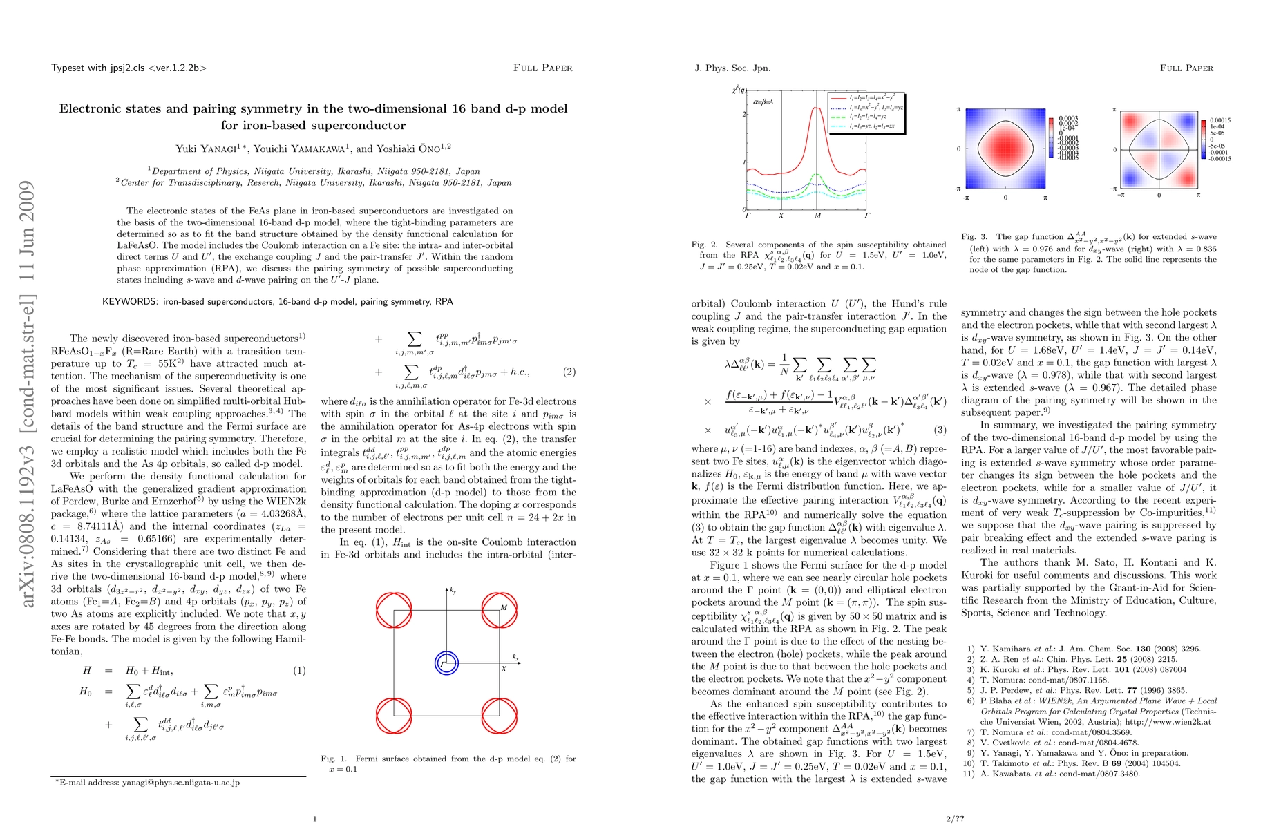 This paper investigates the electronic states and pairing symmetry in iron-based superconductors using a two-dimensional 16-band d-p model, fitting parameters to LaFeAsO's density functional calculation. It explores superconducting states, including s-wave and d-wave pairing, within the random phase approximation on the U'-J plane.