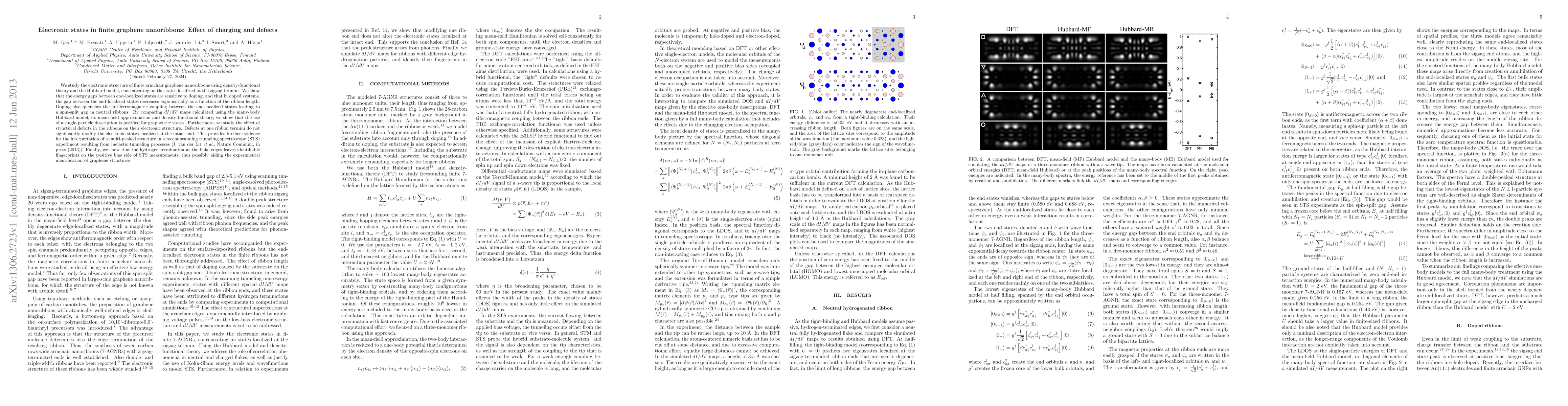 We study the electronic structure of finite armchair graphene nanoribbons using density-functional theory and the Hubbard model, concentrating on the states localized at the zigzag termini. We show that the energy gaps between end-localized states are sensitive to doping, and that in doped systems, the gap between the end-localized states decreases exponentially as a function of the ribbon length. Doping also quenches the antiferromagnetic coupling between the end-localized states leading to a spin-split gap in neutral ribbons. By comparing dI/dV maps calculated using the many-body Hubbard model, its mean-field approximation and density-functional theory, we show that the use of a single-particle description is justified for graphene {\pi} states. Furthermore, we study the effect of structural defects in the ribbons on their electronic structure. Defects at one ribbon termini do not significantly modify the electronic states localized at the intact end. This provides further evidence for the interpretation of a multi-peaked structure in a recent scanning tunneling spectroscopy (STS) experiment resulting from inelastic tunneling processes [J. van der Lit et al., Nature Commun., in press (2013)]. Finally, we show that the hydrogen termination at the flake edges leaves identifiable fingerprints on the positive bias side of STS measurements, thus possibly aiding the experimental identification of graphene structures.