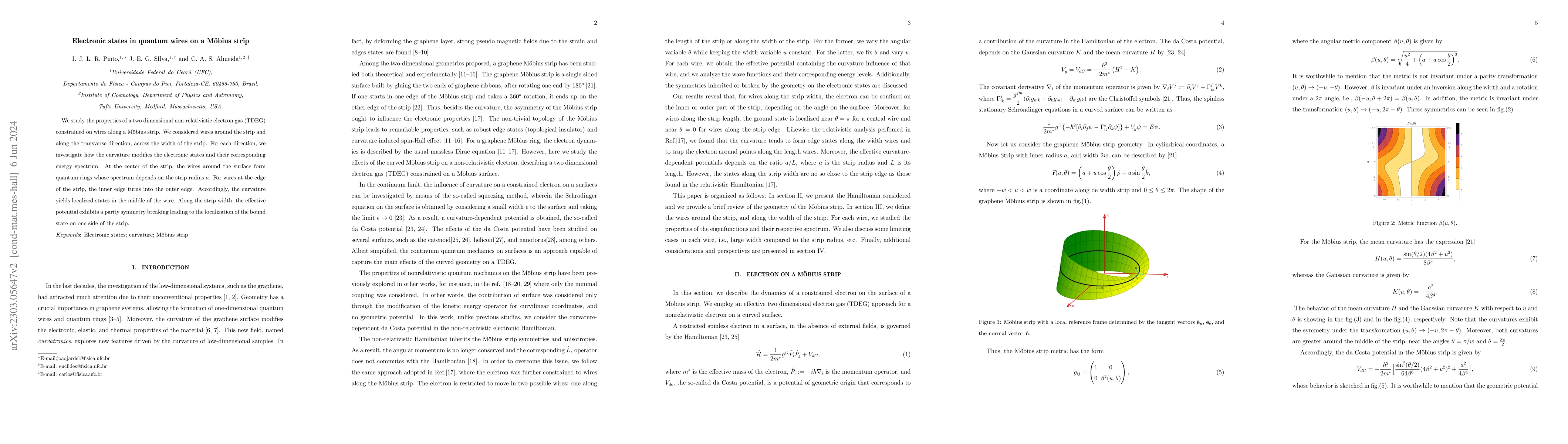 We study the properties of a two-dimensional non-relativistic electron gas (TDEG) constrained on wires along a M\"{o}bius strip. We considered wires around the strip and along the transverse direction, across the width of the strip. For each direction, we investigate how the curvature modifies the electronic states and their corresponding energy spectrum. At the center of the strip, the wires around the surface form quantum rings whose spectrum depends on the strip radius $a$. For wires at the edge of the strip, the inner edge turns into the outer edge. Accordingly, the curvature yields localized states in the middle of the wire. Along the strip width, the effective potential exhibits a parity symmetry breaking leading to the localization of the bound state on one side of the strip.