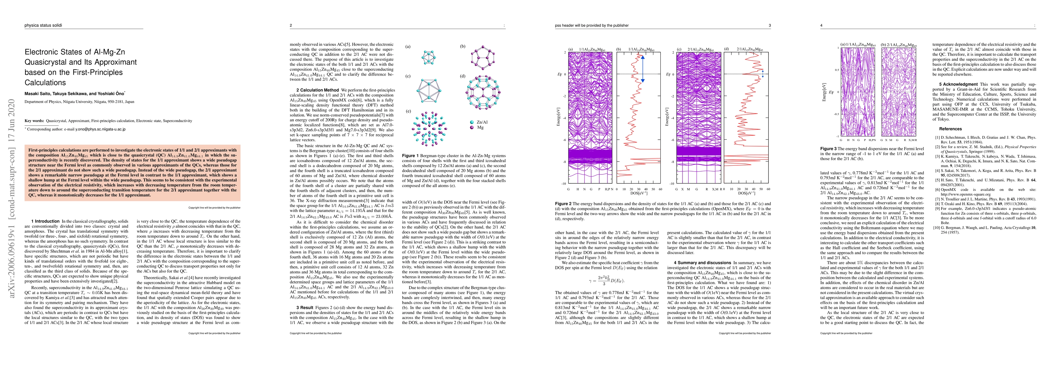 First-principles calculations are performed to investigate the electronic states of 1/1 and 2/1 approximants with the composition Al$_{15}$Zn$_{40}$Mg$_{45}$ which is close to the quasicrystal (QC) Al$_{14.9}$Zn$_{41.0}$Mg$_{44.1}$ in which the superconductivity is recently discovered. The density of states for the 1/1 approximant shows a wide pseudogap structure near the Fermi level as commonly observed in various approximants of the QCs, whereas those for the 2/1 approximant do not show such a wide pseudogap. Instead of the wide pseudogap, the 2/1 approximant shows a remarkable narrow pseudogap at the Fermi level in contrast to the 1/1 approximant, which shows a shallow hump at the Fermi level within the wide pseudogap. This seems to be consistent with the experimental observation of the electrical resistivity, which increases with decreasing temperature from the room temperature down to around the superconducting transition temperature for the 2/1 approximant together with the QC, whereas it monotonically decreases for the 1/1 approximant.