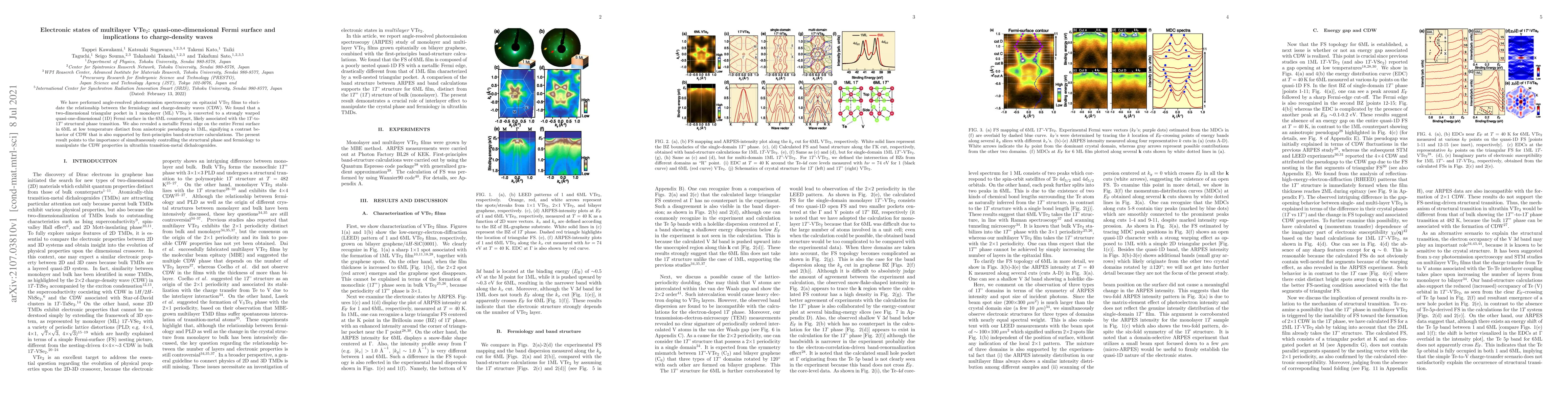 This study uses angle-resolved photoemission spectroscopy to investigate the electronic states of multilayer VTe2, revealing a transition from a two-dimensional to a quasi-one-dimensional Fermi surface in 6ML VTe2 compared to 1ML. The findings suggest distinct charge-density wave behaviors and highlight the importance of structural phase and fermiology control in manipulating CDW properties.