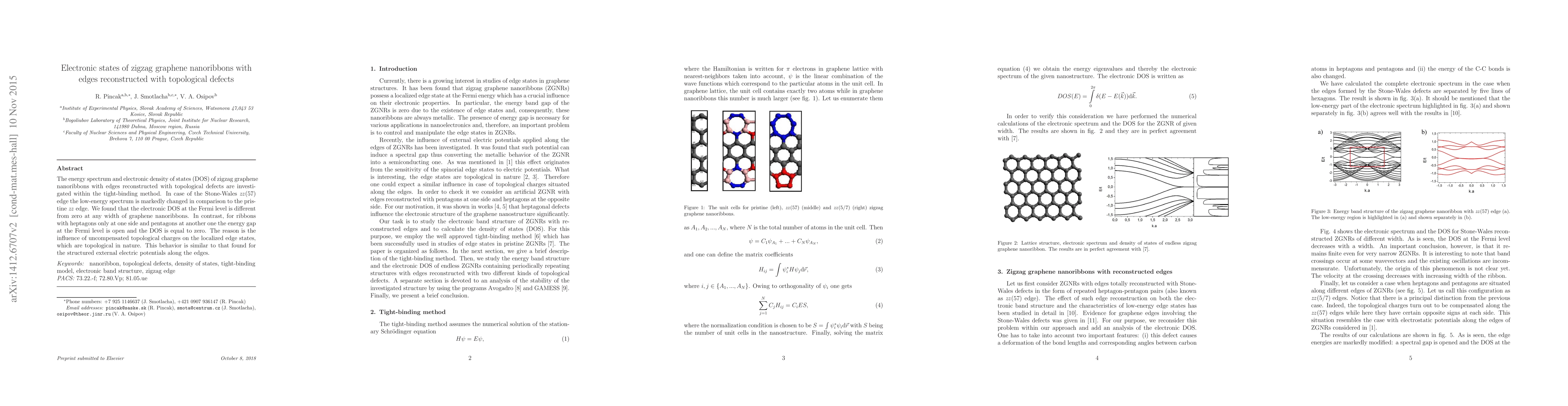 This study investigates the electronic properties of zigzag graphene nanoribbons with reconstructed edges featuring topological defects. The presence of Stone-Wales defects alters the low-energy spectrum, resulting in non-zero density of states at the Fermi level, whereas ribbons with asymmetric heptagons and pentagons show an open energy gap at the Fermi level due to topological influences on localized edge states.