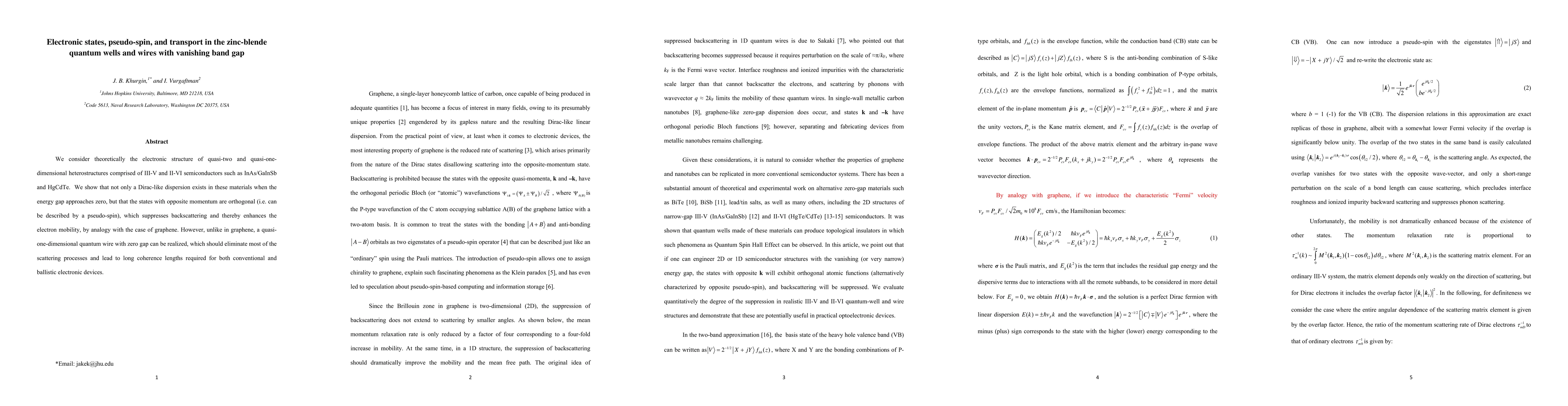 We consider theoretically the electronic structure of quasi-two and quasi-one-dimensional heterostructures comprised of III-V and II-VI semiconductors such as InAs/GaInSb and HgCdTe. We show that not only a Dirac-like dispersion exists in these materials when the energy gap approaches zero, but that the states with opposite momentum are orthogonal (i.e. can be described by a pseudo-spin), which suppresses backscattering and thereby enhances the electron mobility, by analogy with the case of graphene. However, unlike in graphene, a quasi-one-dimensional quantum wire with zero gap can be realized, which should eliminate most of the scattering processes and lead to long coherence lengths required for both conventional and ballistic electronic devices.