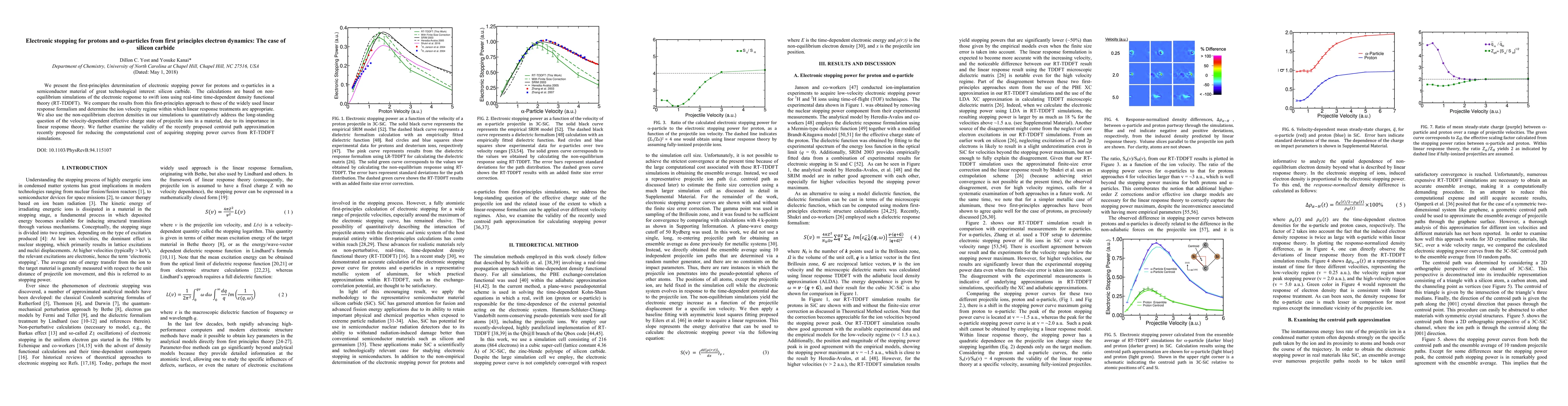 This paper determines the electronic stopping power for protons and alpha particles in silicon carbide using first-principles simulations based on real-time, time-dependent density functional theory. It compares these results with linear response formalism and assesses the validity of the centroid path approximation for computational efficiency.