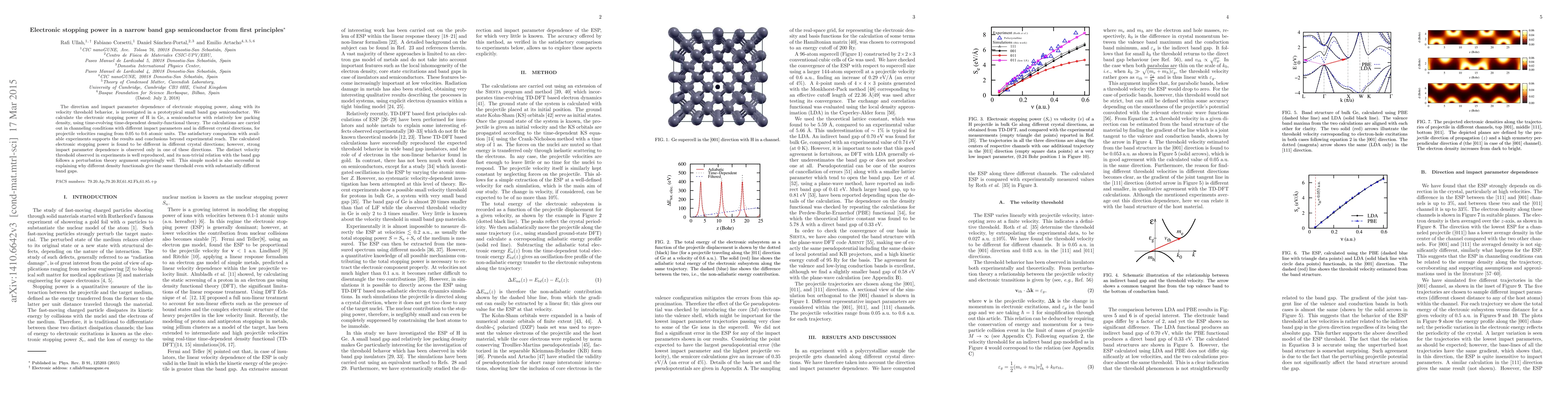 The direction and impact parameter dependence of electronic stopping power, along with its velocity threshold behavior, is investigated in a prototypical small band gap semiconductor. We calculate the electronic stopping power of H in Ge, a semiconductor with relatively low packing density, using time-evolving time-dependent density-functional theory. The calculations are carried out in channeling conditions with different impact parameters and in different crystal directions, for projectile velocities ranging from 0.05 to 0.6 atomic units. The satisfactory comparison with available experiments supports the results and conclusions beyond experimental reach. The calculated electronic stopping power is found to be different in different crystal directions; however, strong impact parameter dependence is observed only in one of these directions. The distinct velocity threshold observed in experiments is well reproduced, and its non-trivial relation with the band gap follows a perturbation theory argument surprisingly well. This simple model is also successful in explaining why different density functionals give the same threshold even with substantially different band gaps.
