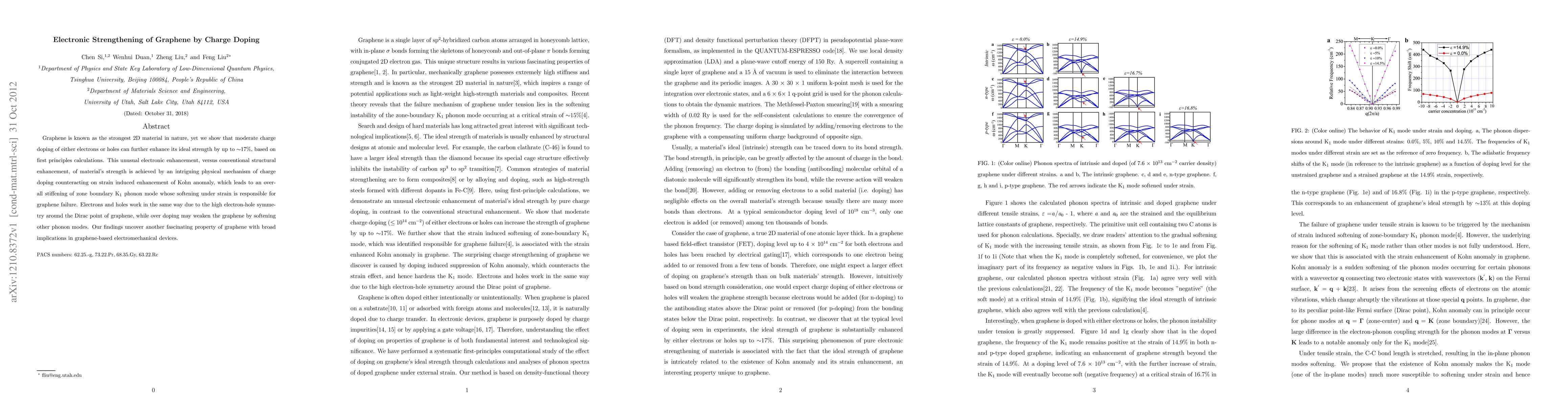 This study demonstrates that moderate charge doping of graphene can enhance its ideal tensile strength by up to 17% through an electronic mechanism that stiffens the K1 phonon mode, countering its softening under strain. The findings reveal a new dimension to graphene's mechanical properties, with implications for graphene-based electromechanical applications.